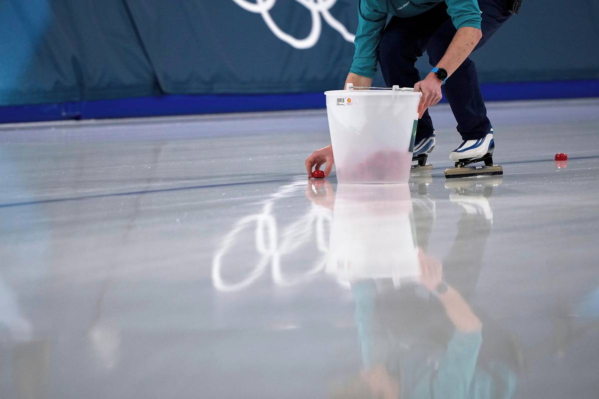 Organizátoři pokládají značky před závodem rychlobruslařů na 5000 metrů