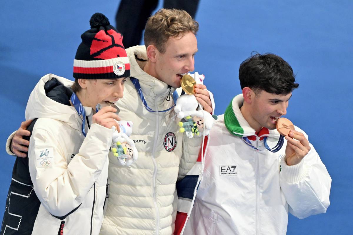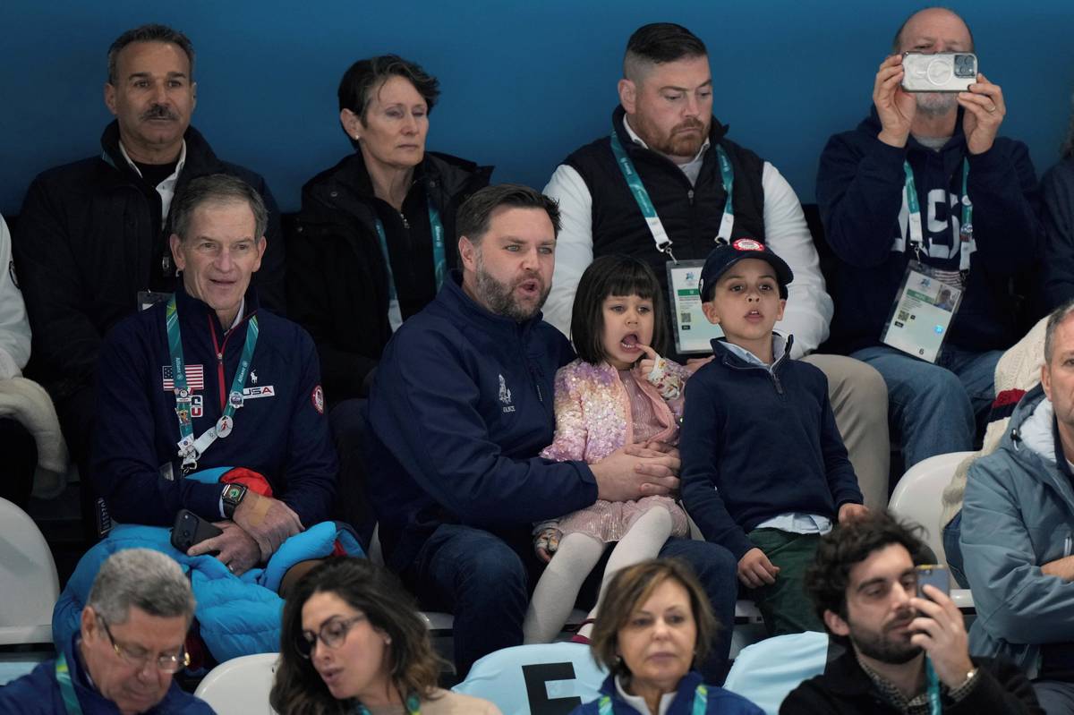 Viceprezident Spojených států J.D. Vance (uprostřed) byl přítomen olympijskému rychlobruslařskému závodu na 5000 metrů