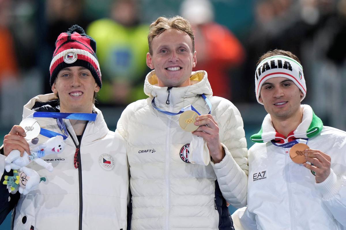 Sander Eitrem z Norska (vlevo) a Metoděj Jílek při olympijském závodě na 5000 metrů
