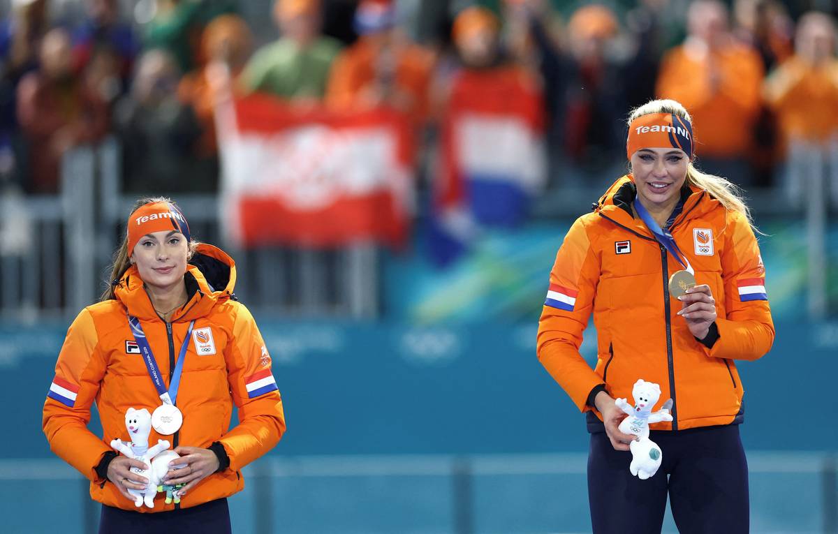 Olympijská vítězka v rychlobruslení z trati 1000 metrů Jutta Leerdamová (vpravo) a vedle ní stříbrná nizozemská krajanka Femke Koková.
