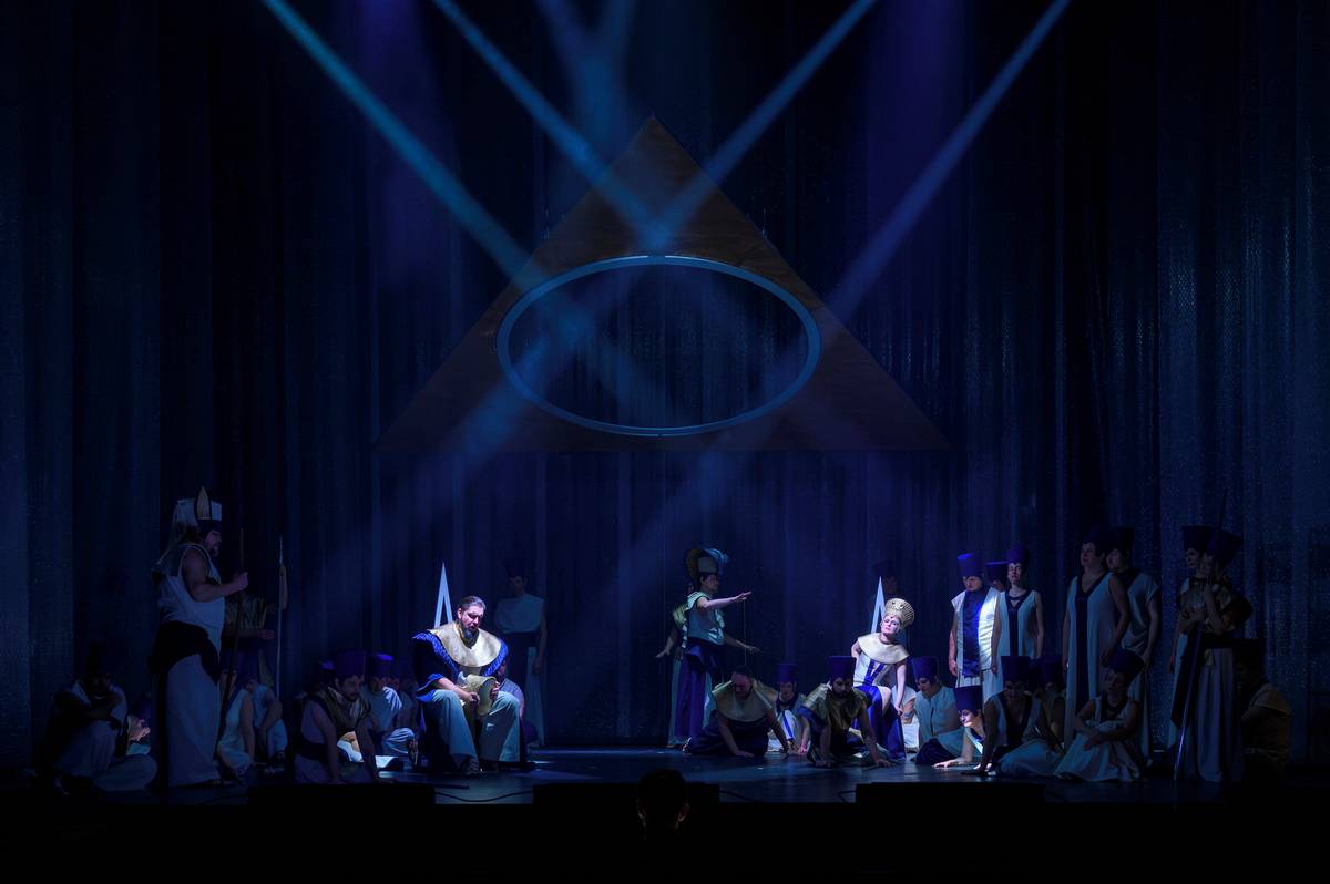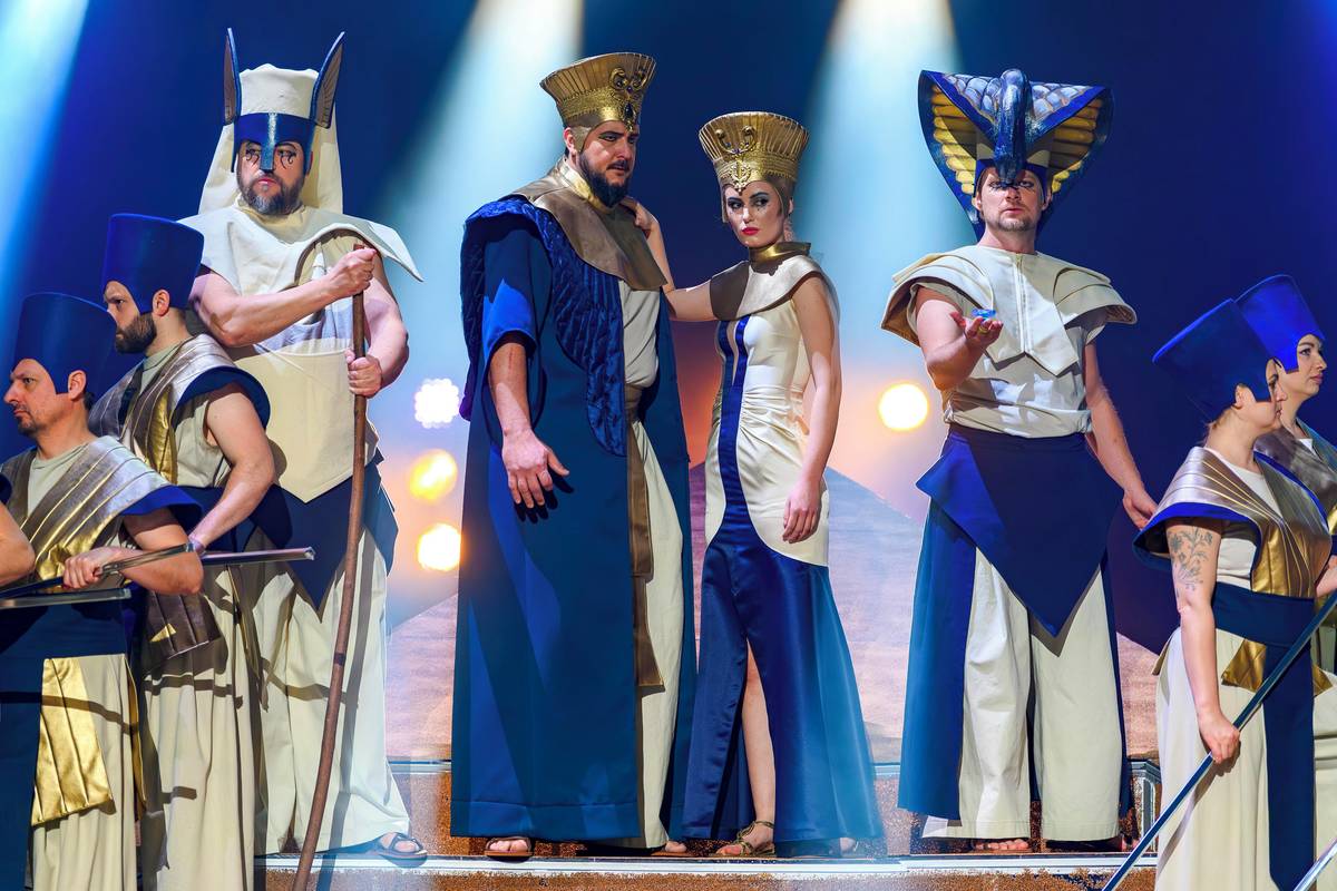 Na fotografii jsou Daniel Kfelíř jako faraon, Veronika Kaiserová v roli jeho manželky Sinaidy a Martin Javorský coby faraonův syn Amenofis.