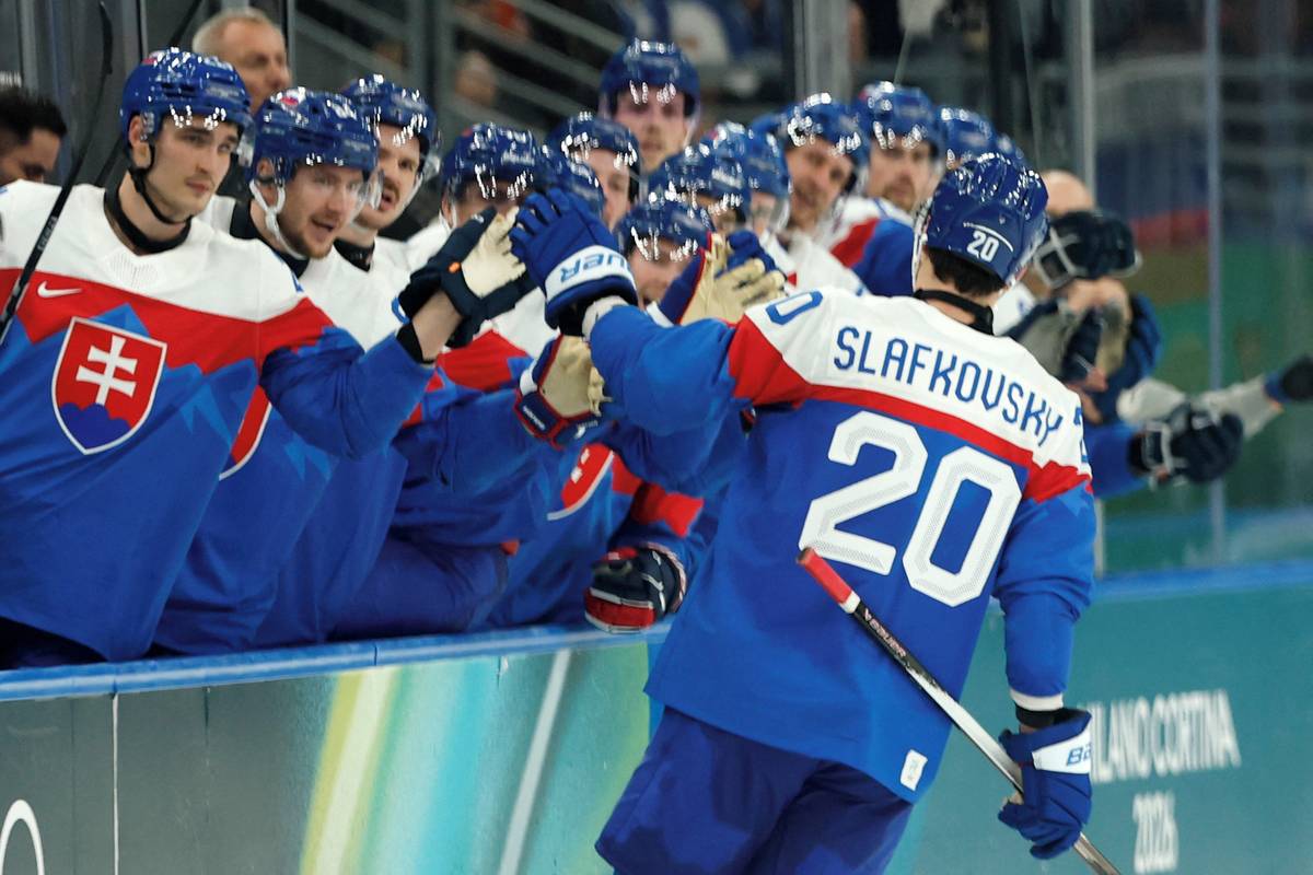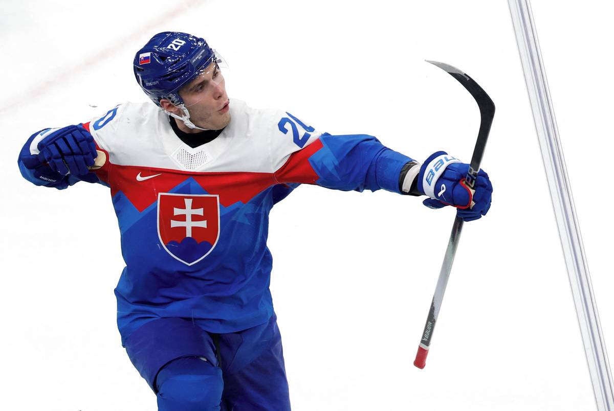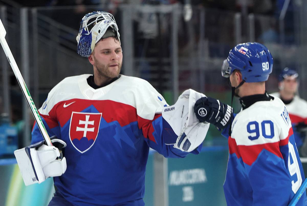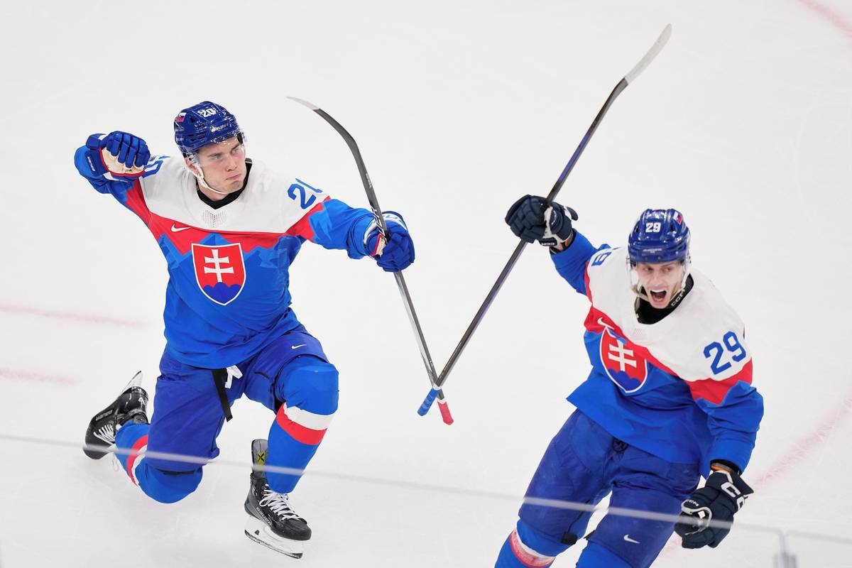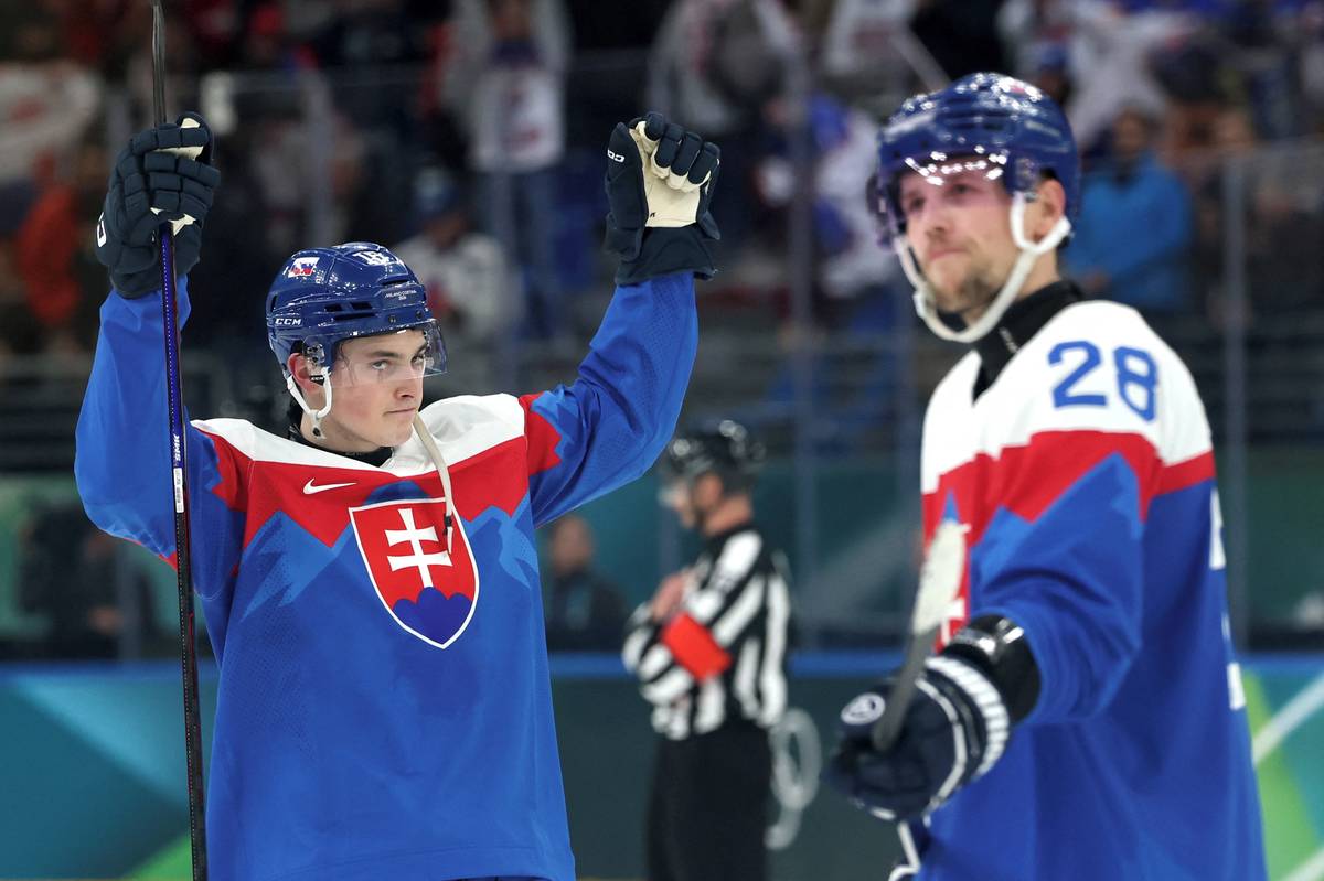 Juraj Slafkovský (vpravo) vstřelil první gól olympijského turnaje