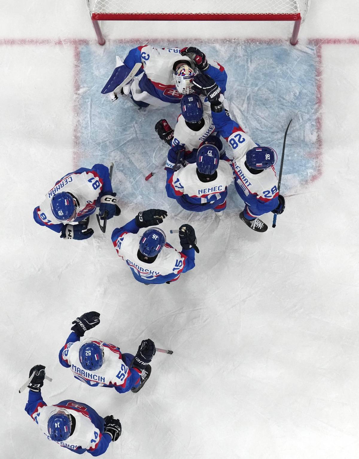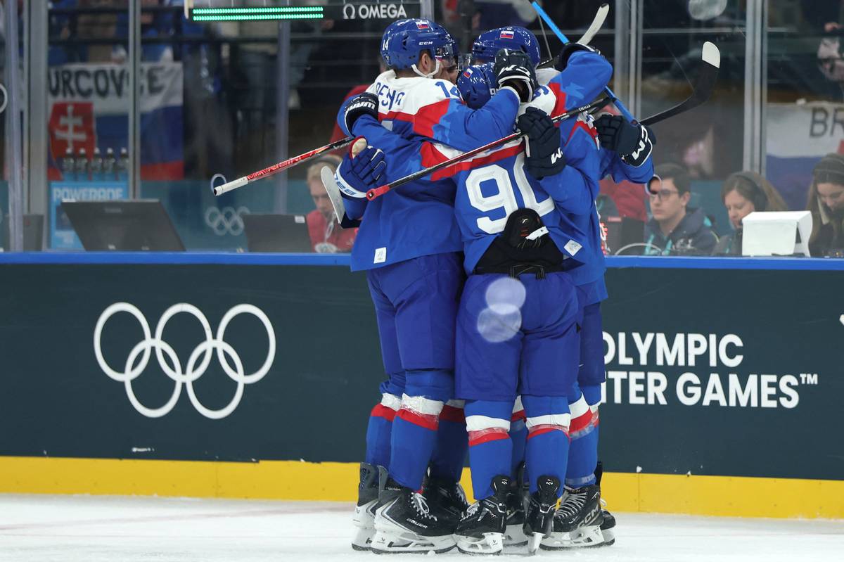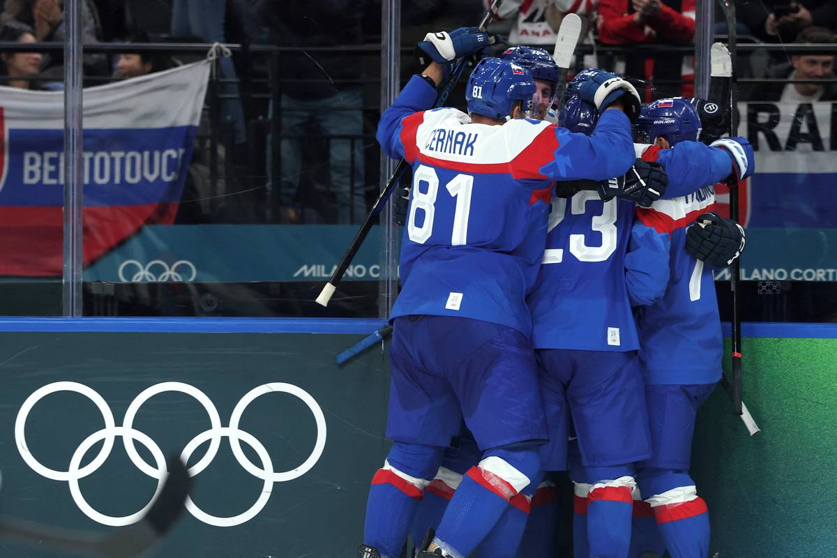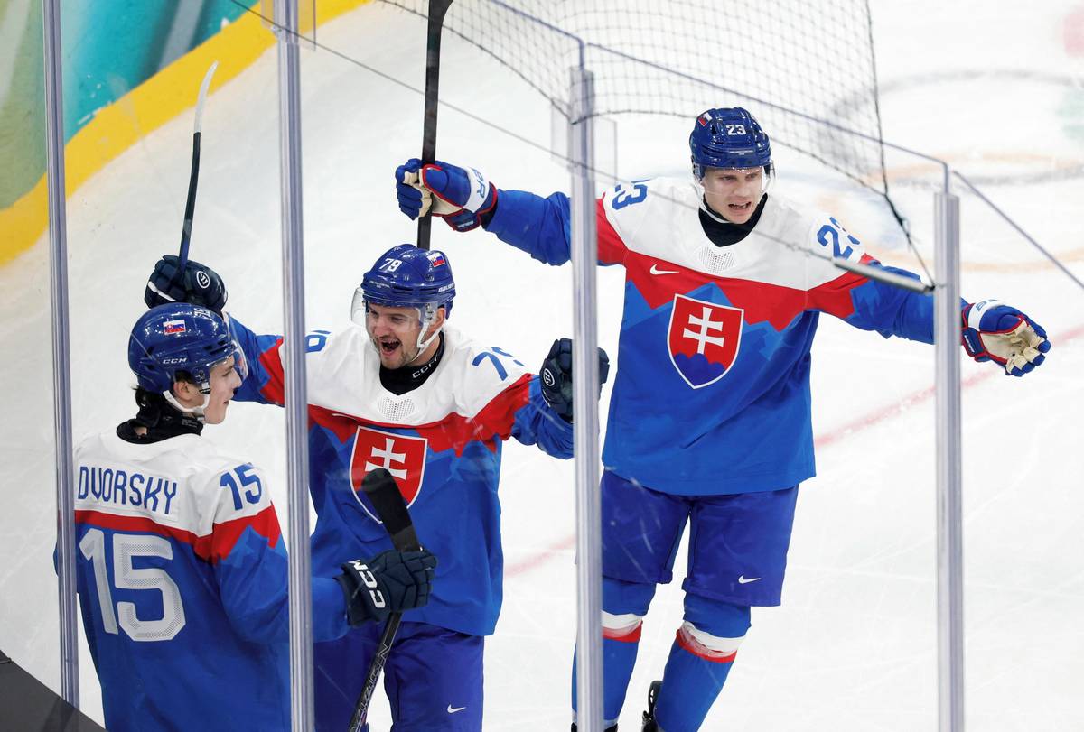 Juraj Slafkovský (vpravo) vstřelil první gól olympijského turnaje