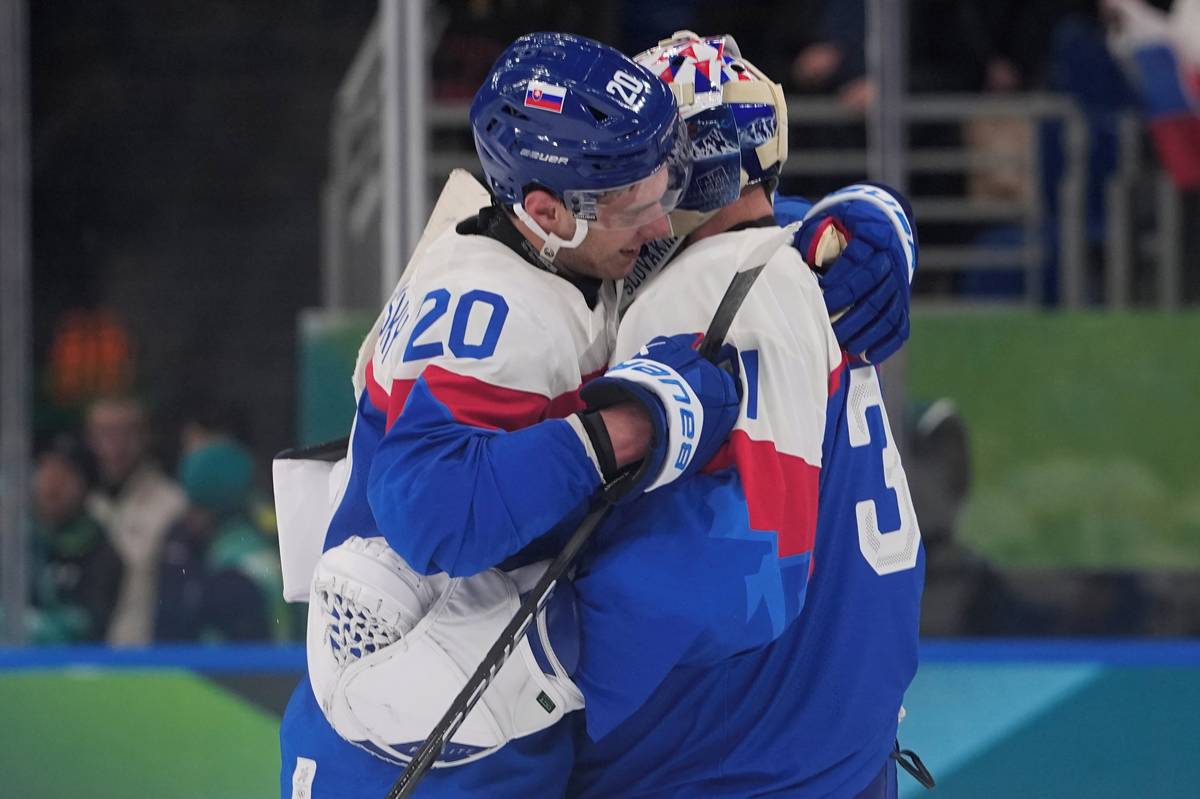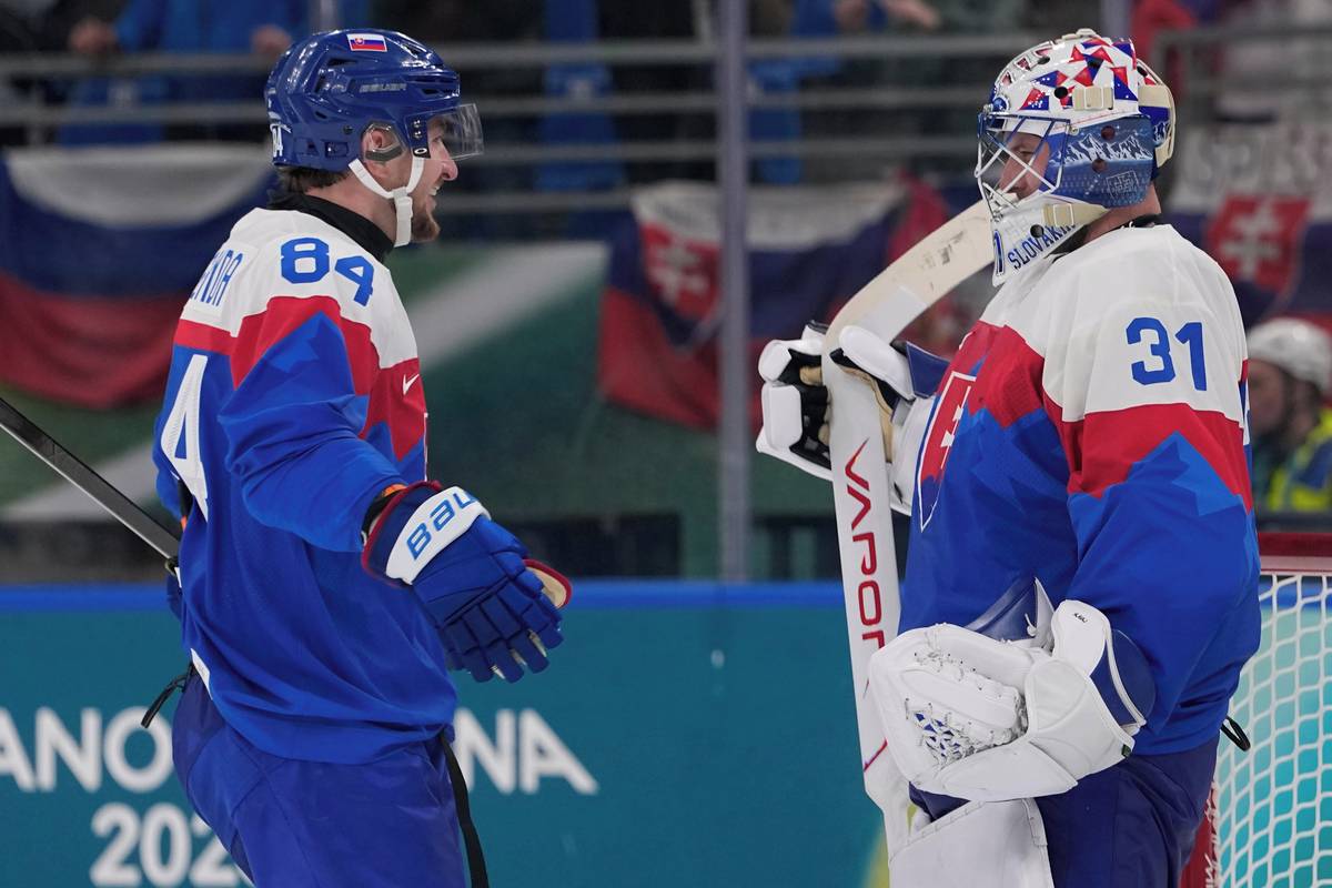 Útočník Juraj Slafkovský a brankář Samuel Hlavaj po výhře nad Finskem