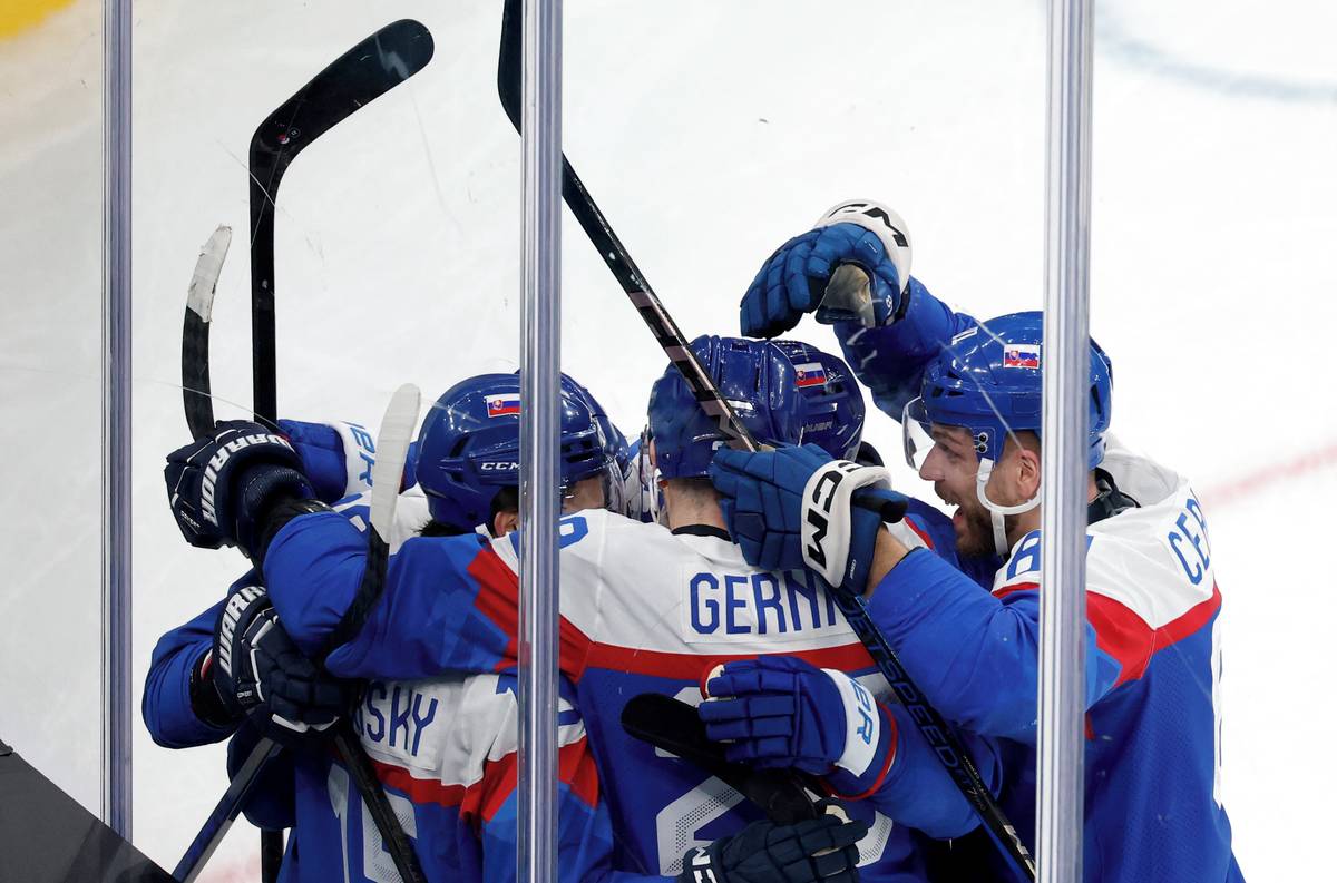 Juraj Slafkovský slavící se spoluhráči svou druhou trefu do sítě Finska