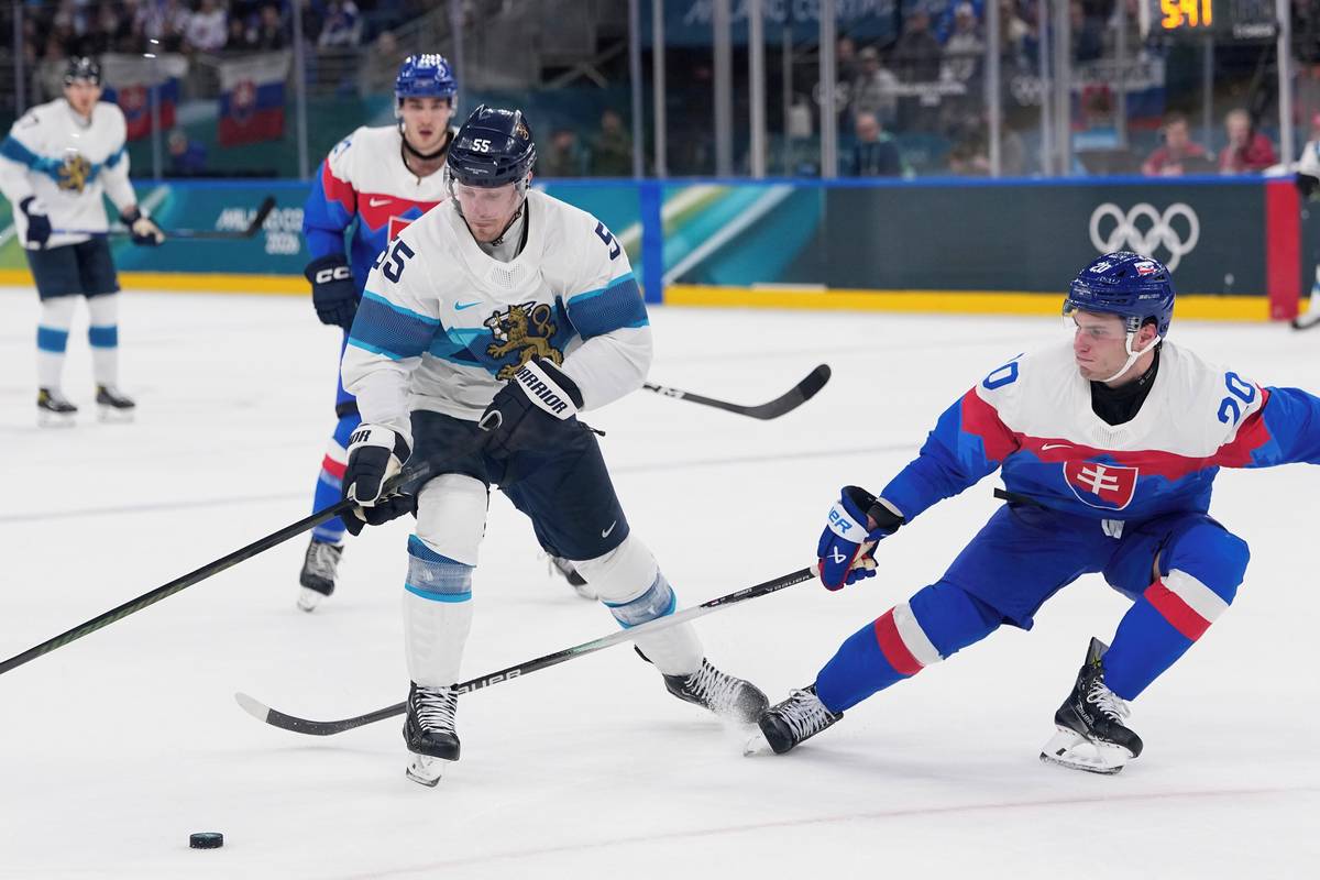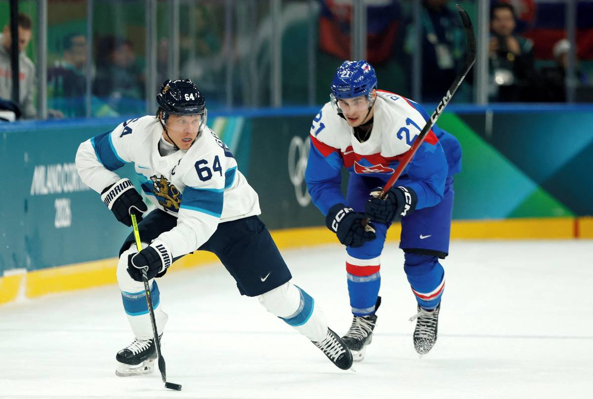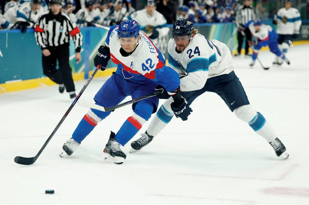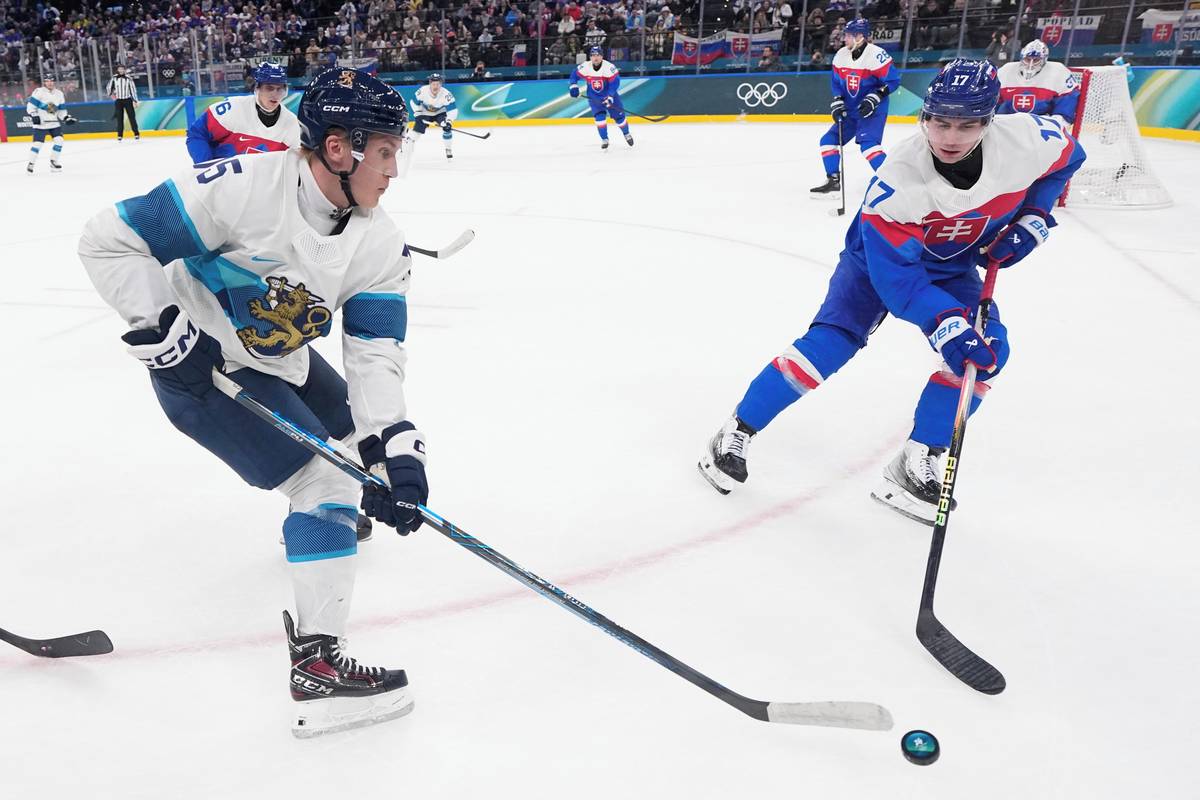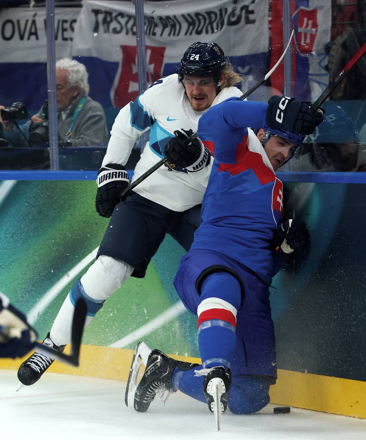 Adam Ružička ze Slovenska svádí souboj o puk s Mikaelem Granlundem z Finska.