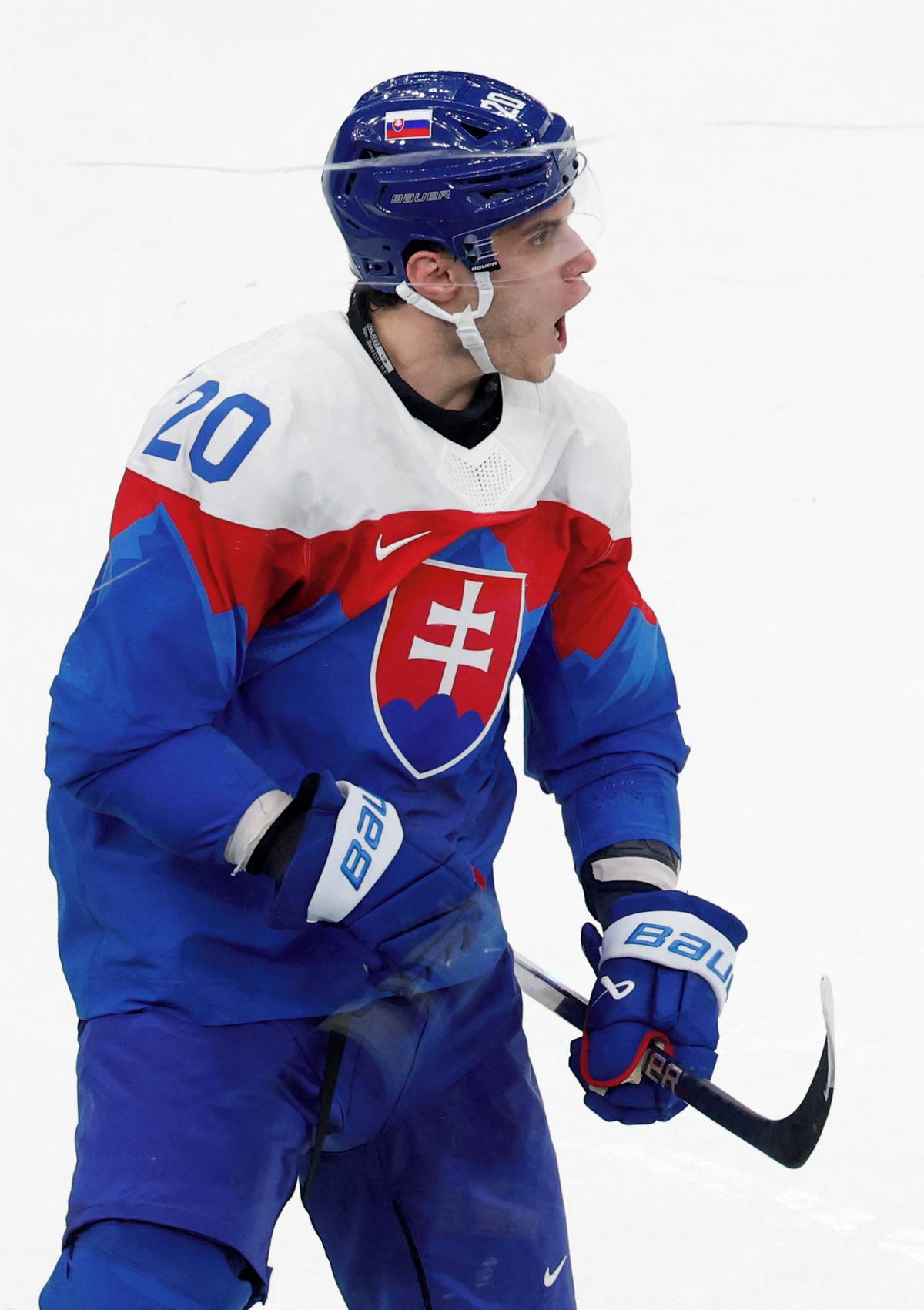 Radost Juraje Slafkovského po jeho druhé trefě na olympijském turnaji