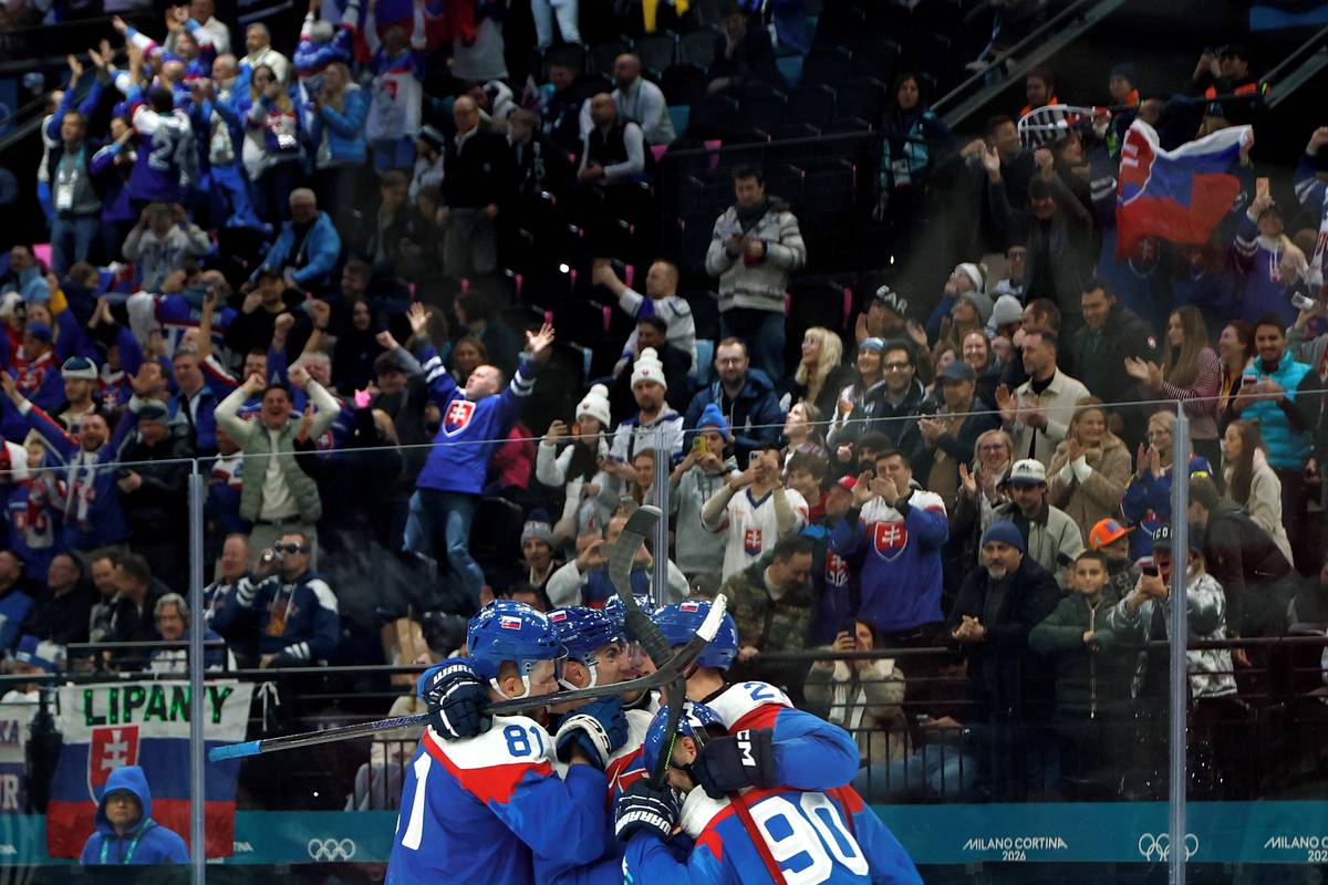 Juraj Slafkovský (vlevo) po vstřelené první brance na olympiádě