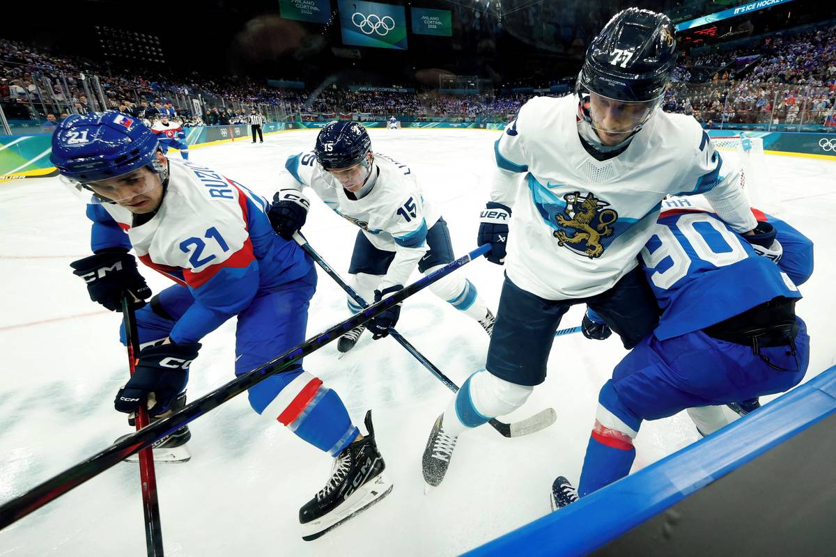 Erik Černák a Martin Gernát ze Slovenska svádějí souboj o puk s Eetuem Luostarinenem z Finska.