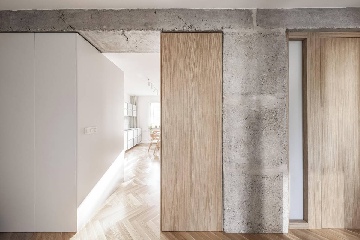 Napříč bytem se táhne obnažený nosný systém.