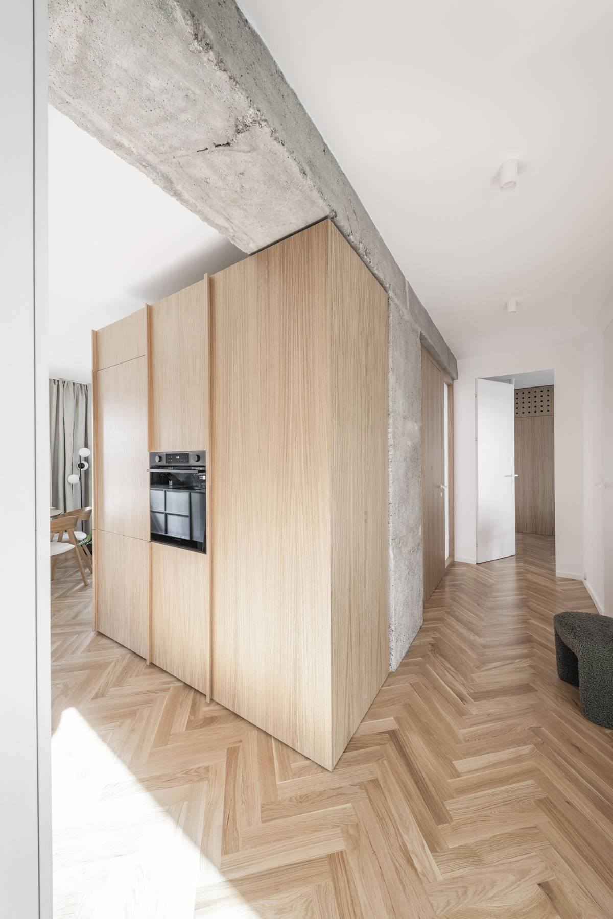 Do centrálního boxu jsou na straně kuchyně chytře umístěné některé spotřebiče.
