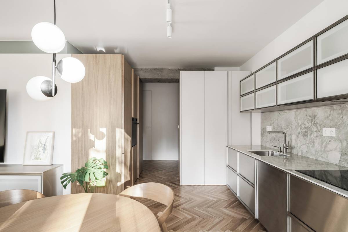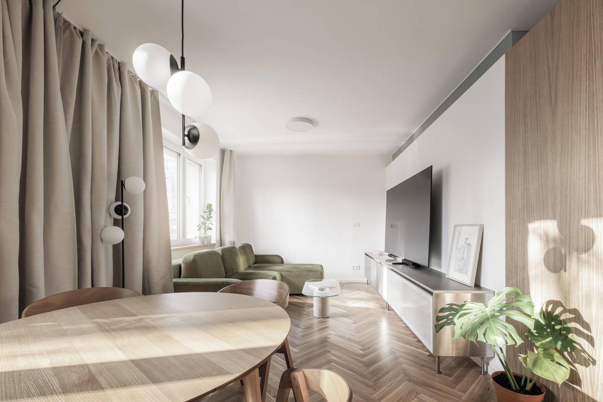 Architekt v bytě odstranil příčky a hlavní obytný prostor ponechal propojený.