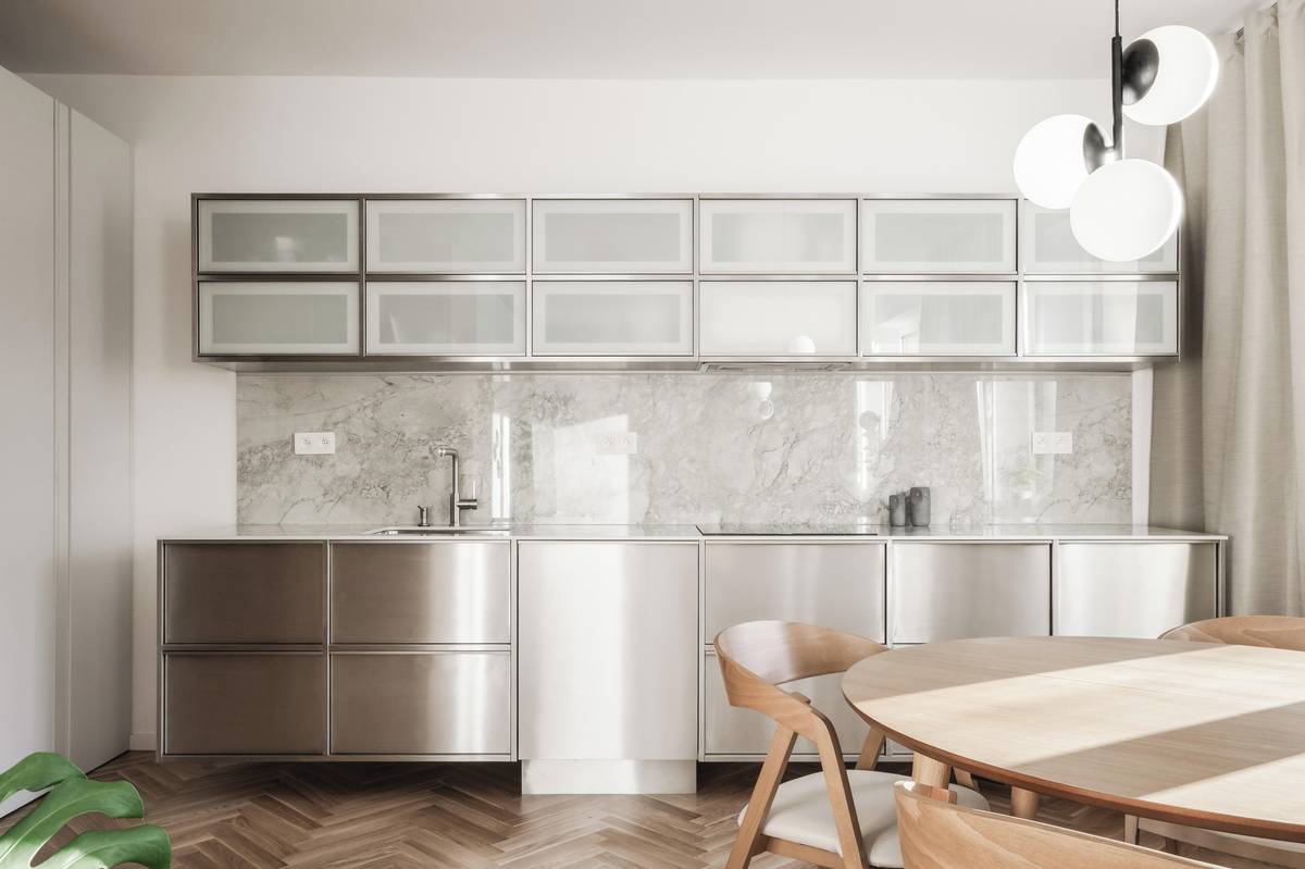 Skříňky kuchyňské linky mají povrch z nerezu.
