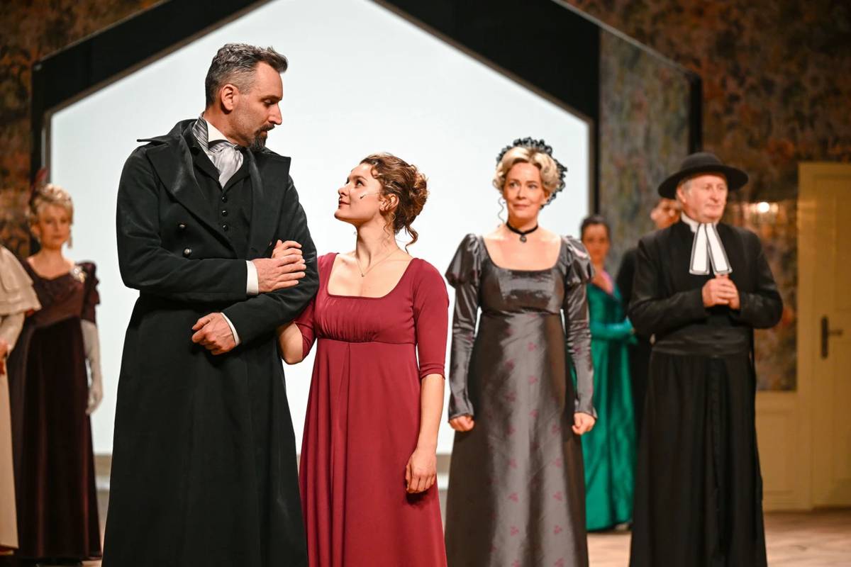 Elinor a rodinné přátele trápí špatný zdravotní stav mladší sestry Marianne. Zleva: Jiří Mach, Svetlana Janotová, Miroslav Čížek a Markéta Sedláčková