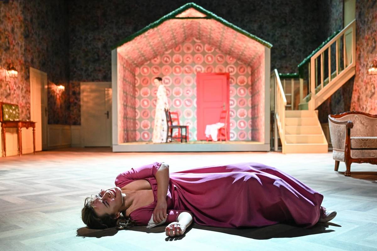 Pohled na scénu Marka Cpina k inscenaci Rozum a cit, vpředu leží Marianne (Nikol Wetterová).