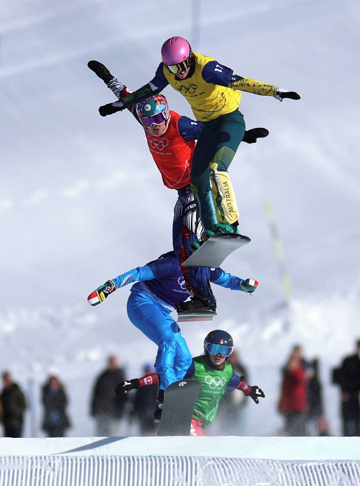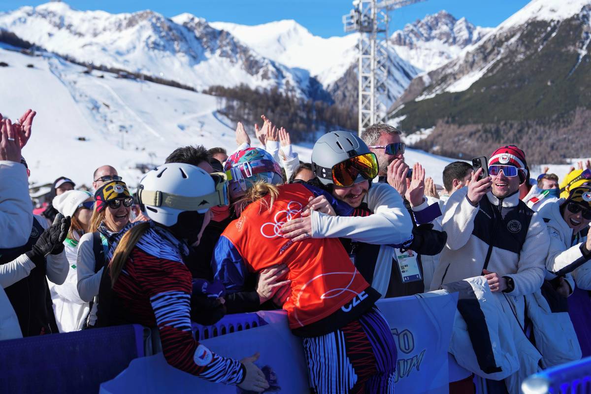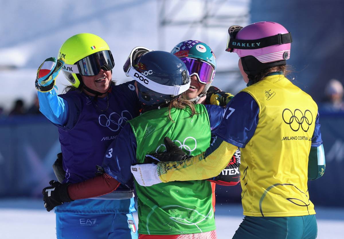 Společná radost po finále. Domácí Michela Moioliová (vlevo) má bronz, uprostřed je Eva Adamczyková a přibíhá vítězka Josie Baffová. Přidala se i čtvrtá Švýcarka Wiedmerová (v zeleném).