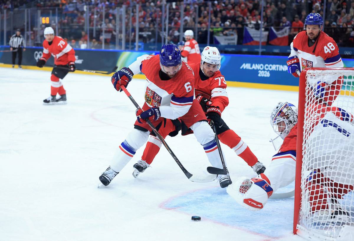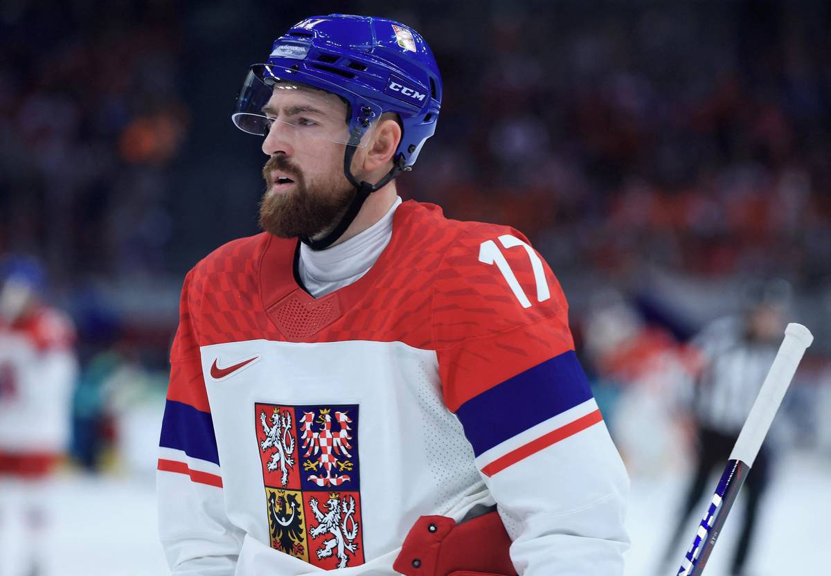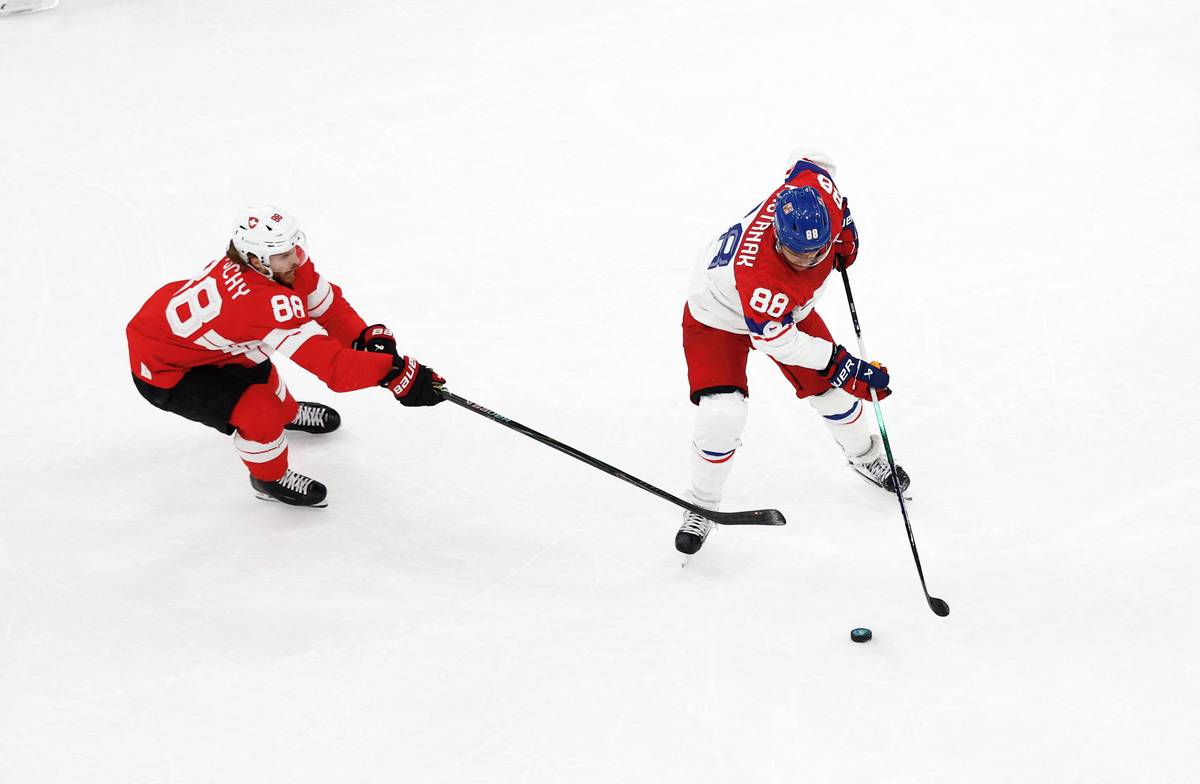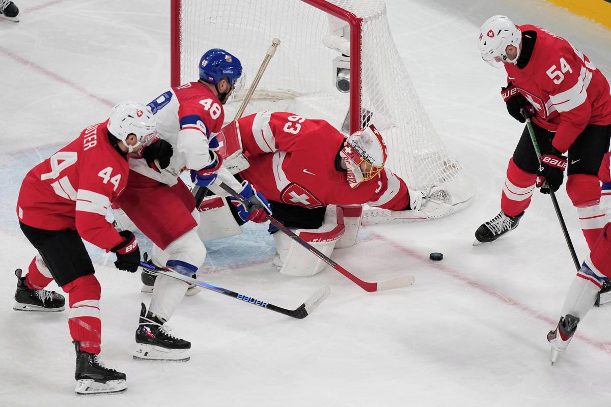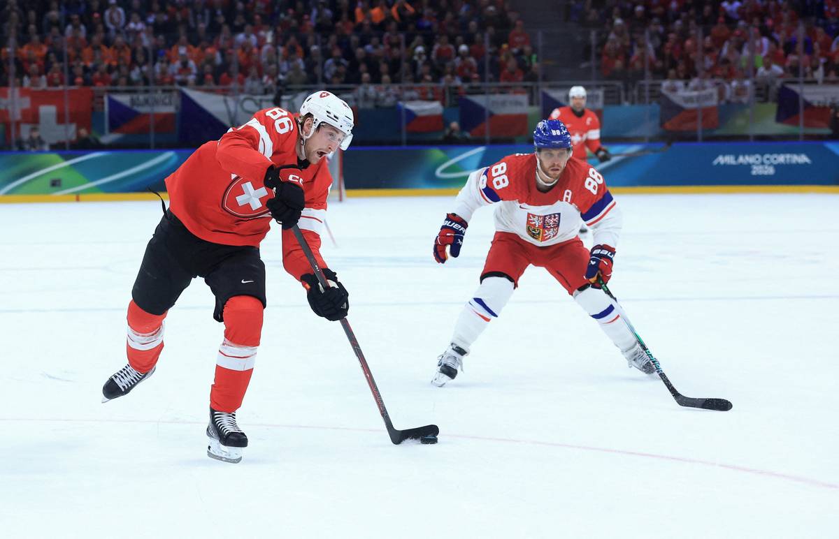 Filip Hronek ukazuje Švýcarům svůj důraz.