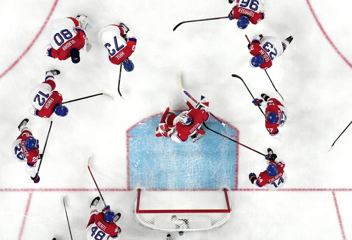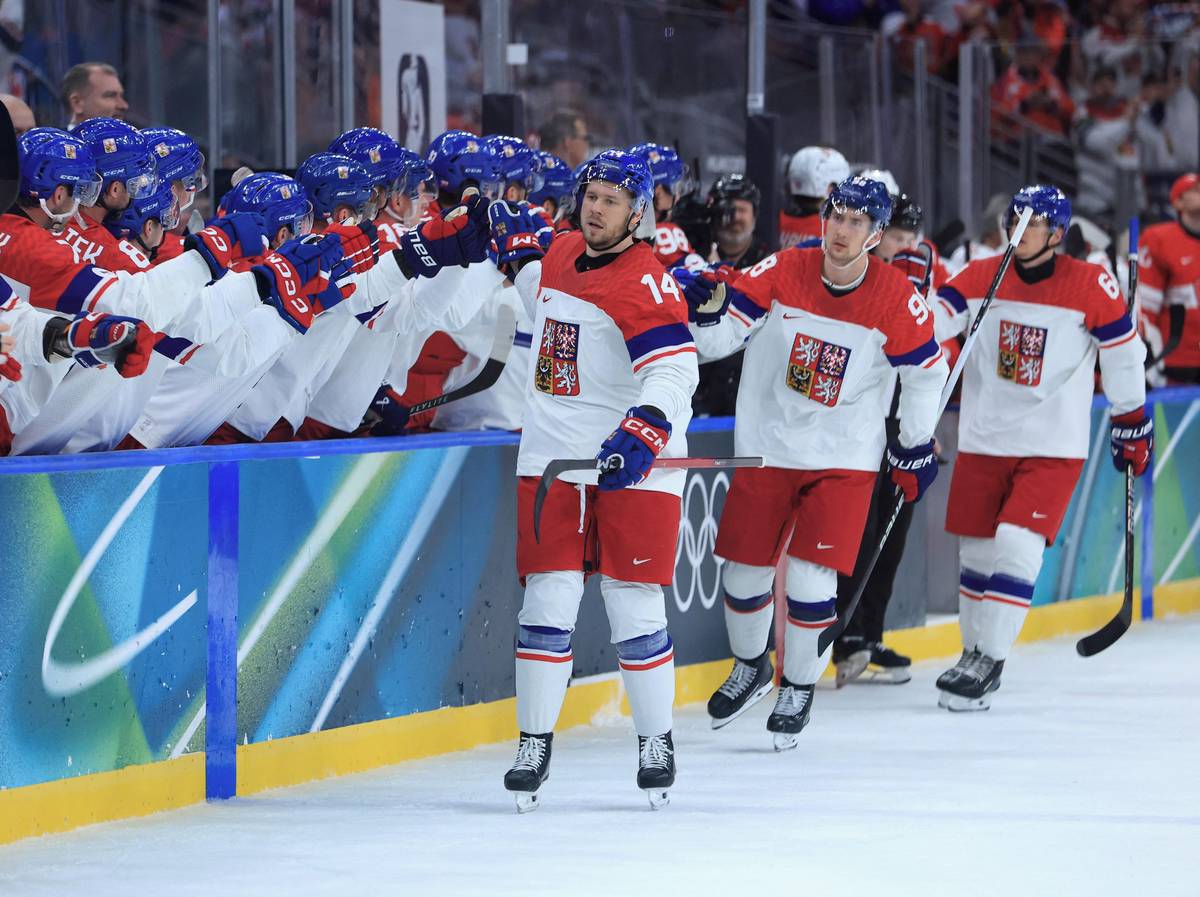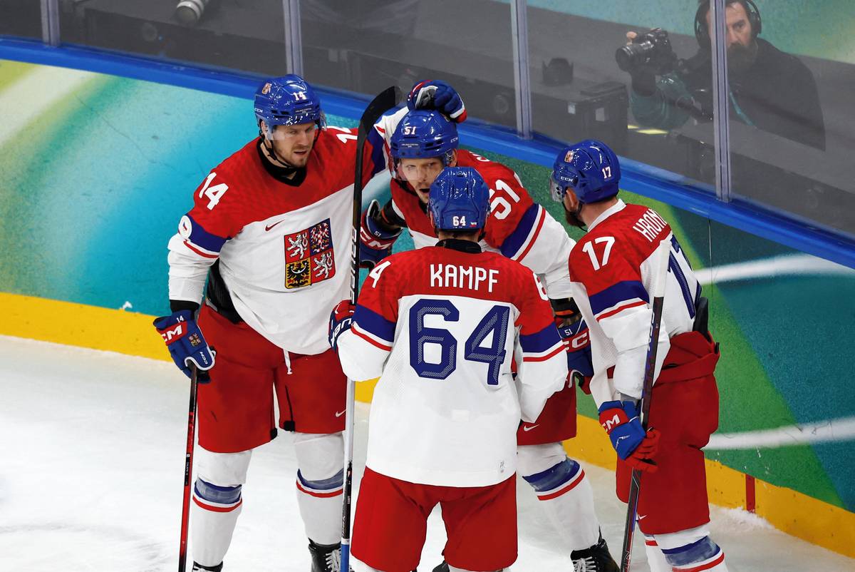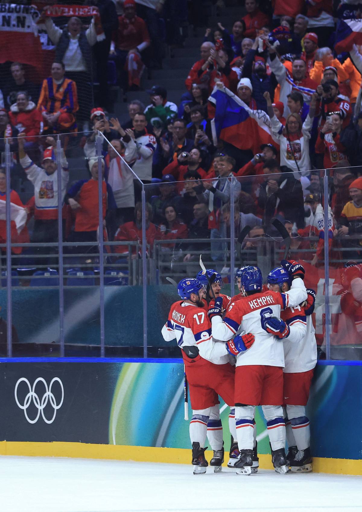 Radost českých hokejistů po vstřelené brance Filipa Chlapíka