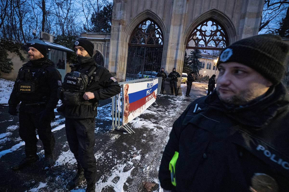 Asi 150 lidí, převážně rodilých Rusů, se sešlo před ruskou ambasádou v Praze.