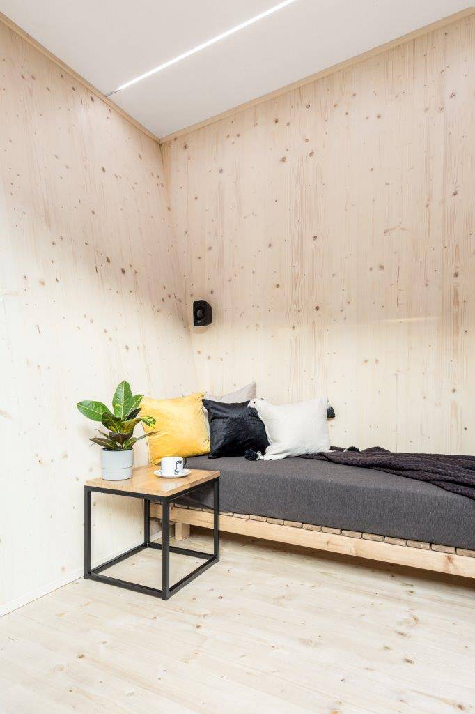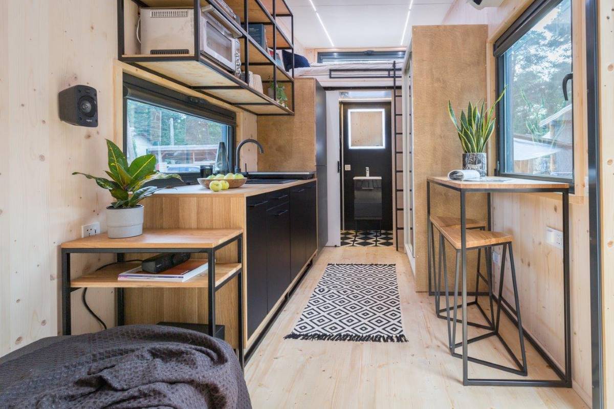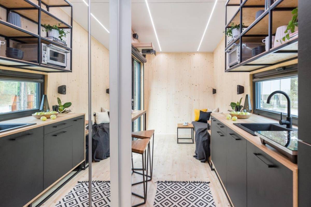 Interiér je rozdělen na tři hlavní zóny – obývací, kuchyňskou a jídelní, a koupelnu s loftem.
