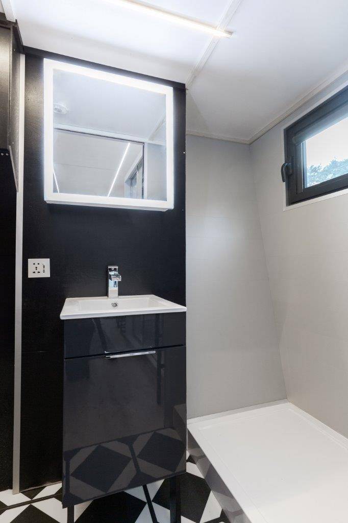 Vnitřek domku pomáhá opticky zvětšit i zrcadlová skříň. (na snímku vlevo)