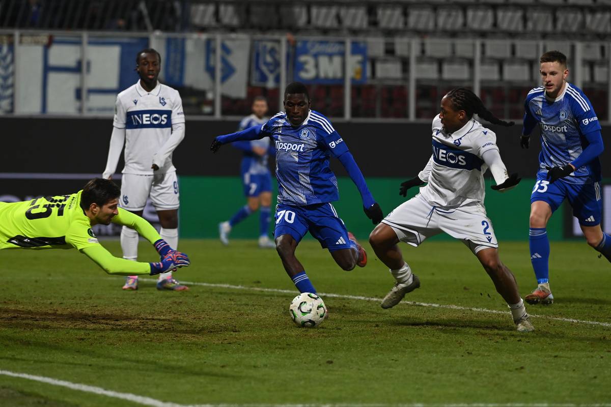 Zleva Ahmad Ghali z Olomouce, Olivier Custodio z Laussane a brankář Karlo Letica z Laussane.