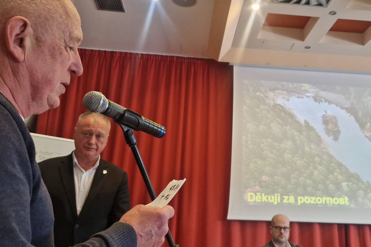 Předání petice za zachování jezera v hotelu Studánka do rukou náměstka ministra zemědělství (vzadu)