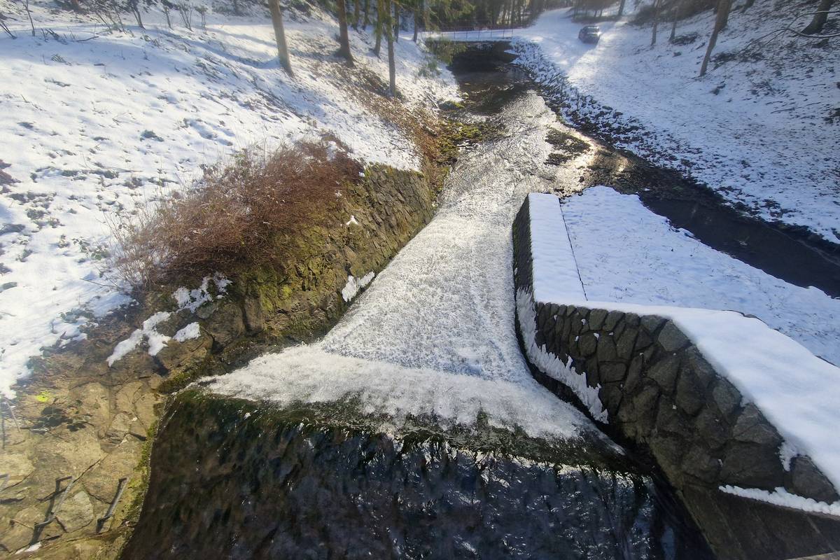 Zděná hráz je 82 metrů dlouhá a sedm metrů vysoká.
