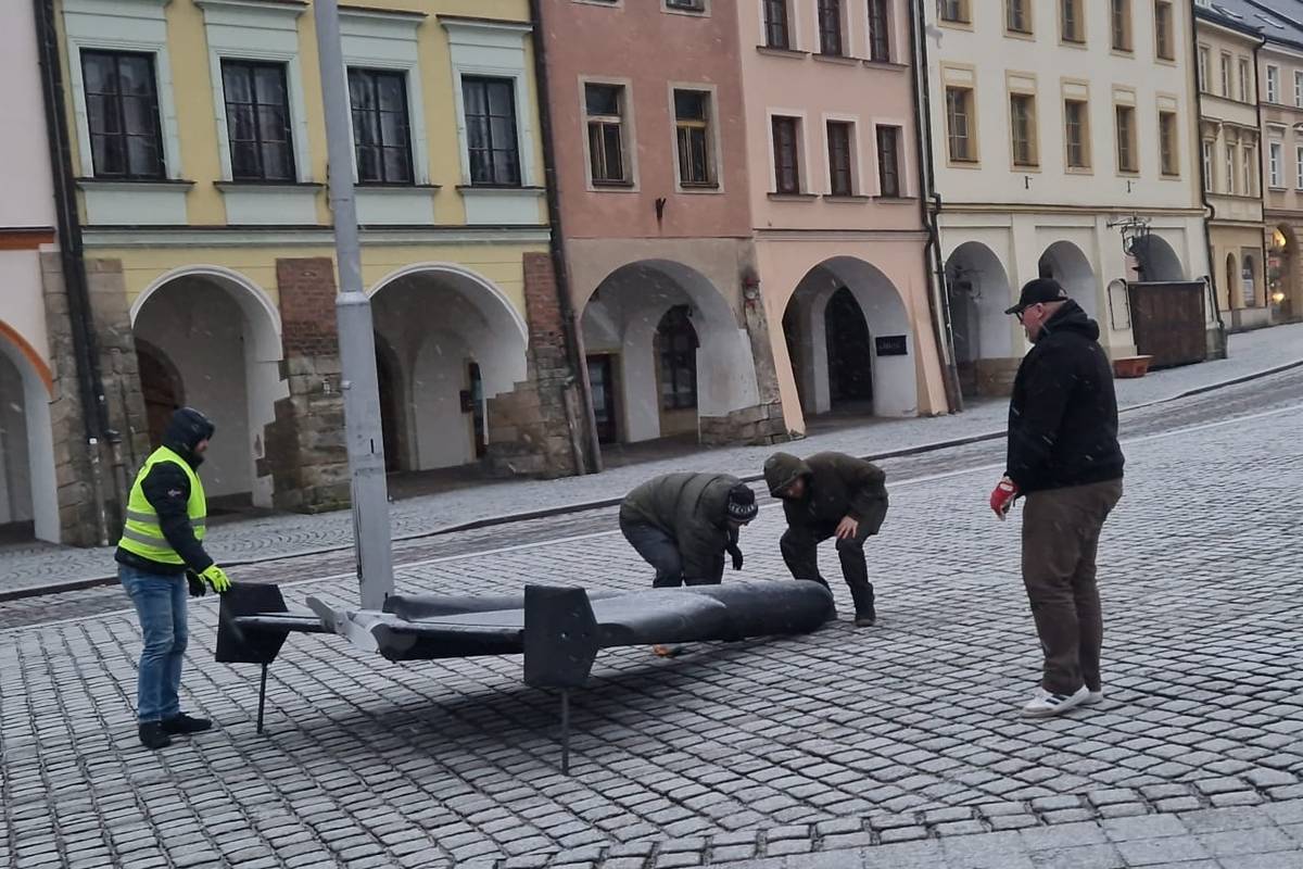 Instalace makety dronu na Malém náměstí v Hradci Králové.