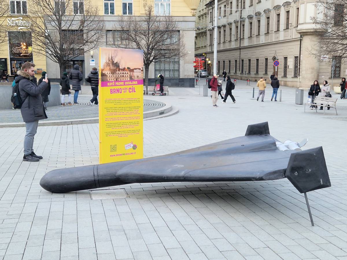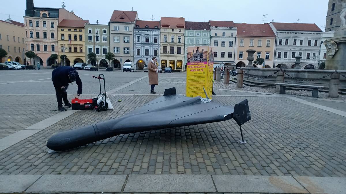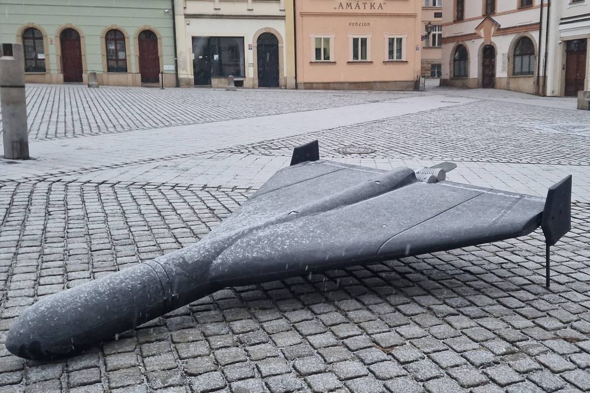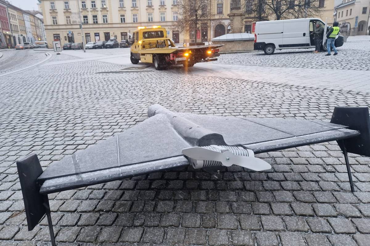 Maketa ruského dronu se v Brně objevila na náměstí Svobody poblíž brněnského orloje.