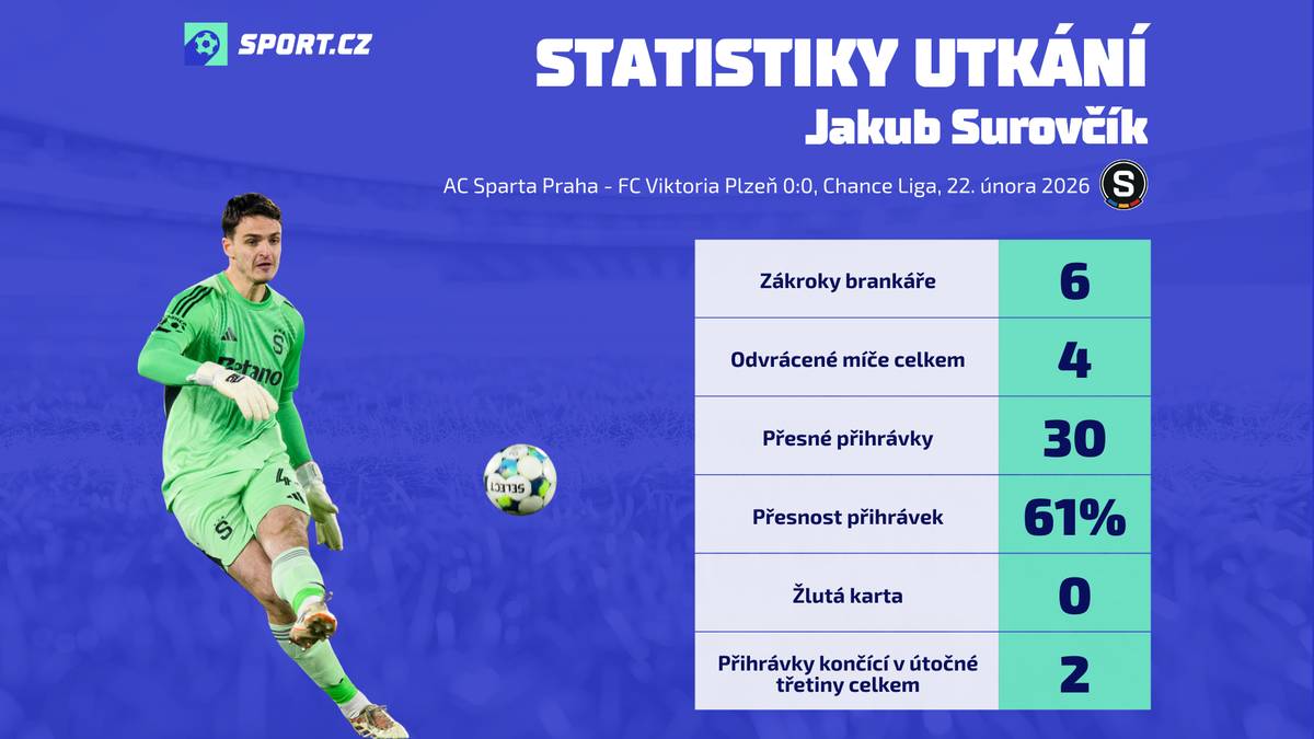 Vybrané statistiky gólmana Jakuba Surovčíka z ligového utkání mezi Plzní a Spartou dle dat společnosti Opta.