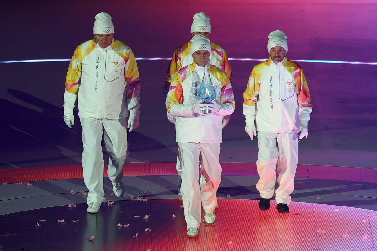 Olympijský oheň přinesli členové slavné italské štafety v behu na lyžích. Maurilio De Zolt, Marco Albarello, Giorgio Vanzetta s Silvio Fauner, vítězové olympiády v Lillehameru z roku 1994.