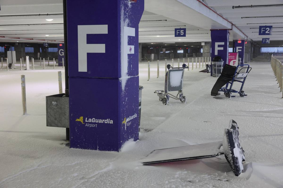 Místní letiště kvůli bouři zaznamenala rozsáhlá rušení letů a zpoždění. Sníh zavál i parkoviště u letiště LaGuardia.