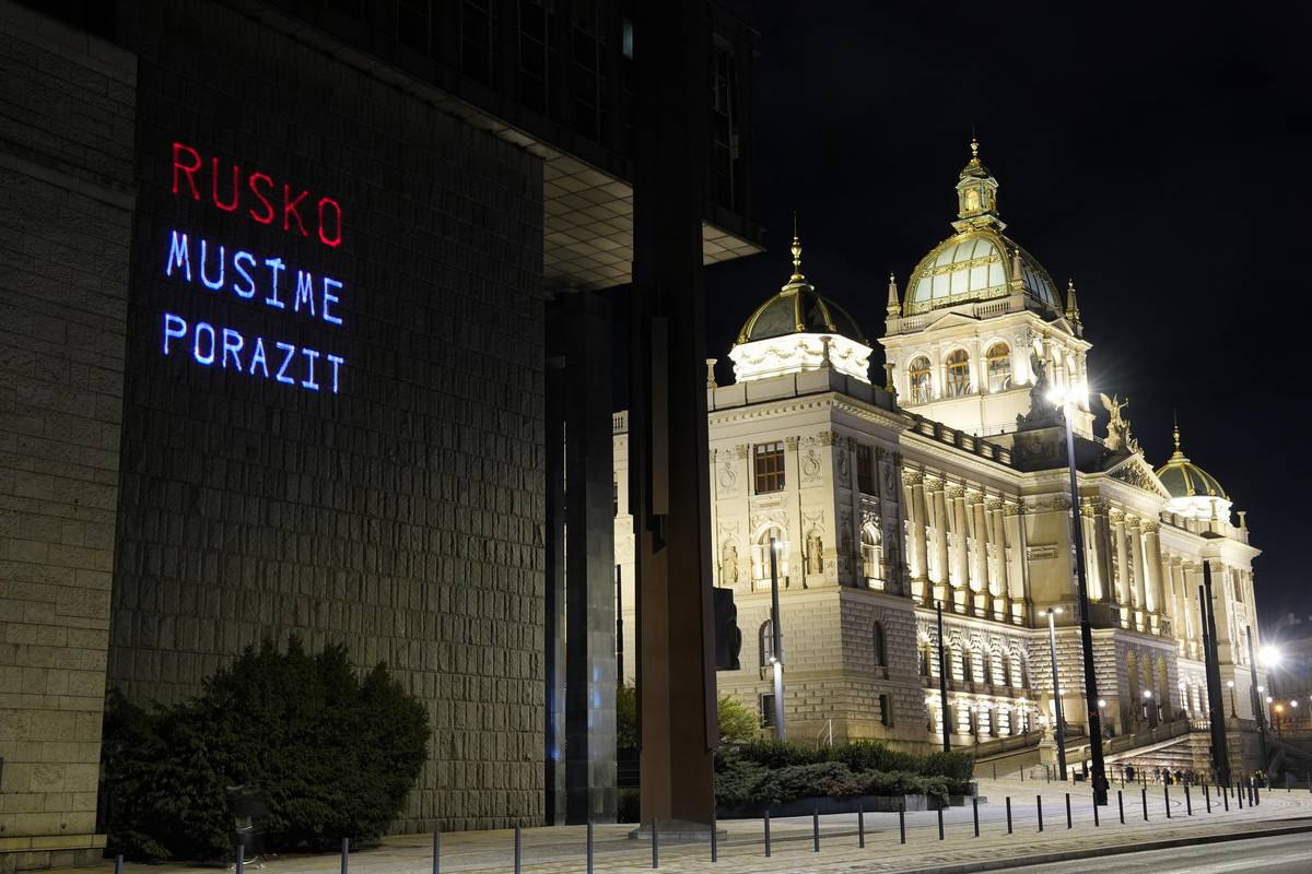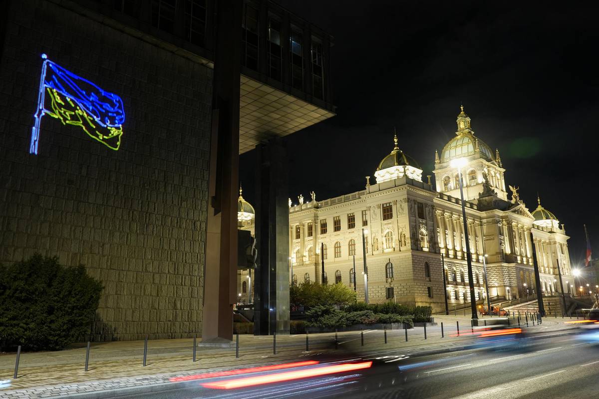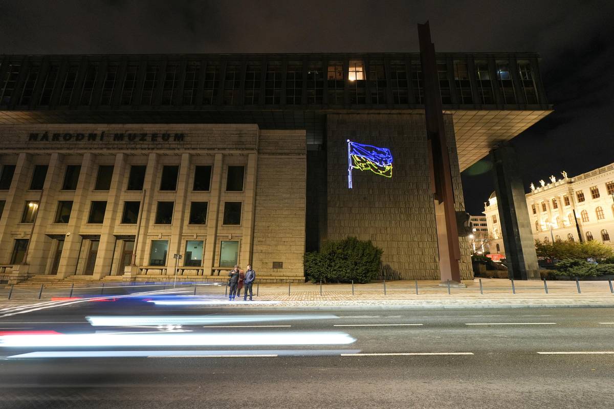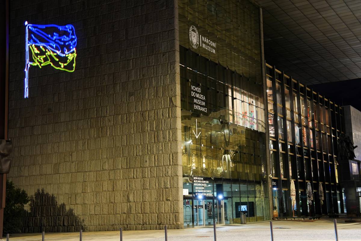 Spolky Kaputin a Občanský rozcestník umístily pomocí laseru vlajku Ukrajiny na novou budovu Národního muzea k výročí vpádu Ruska na Ukrajinu.