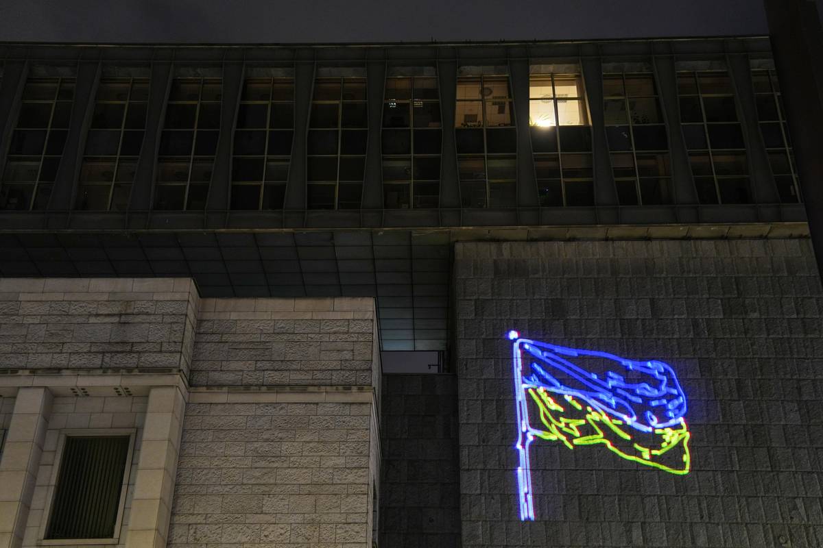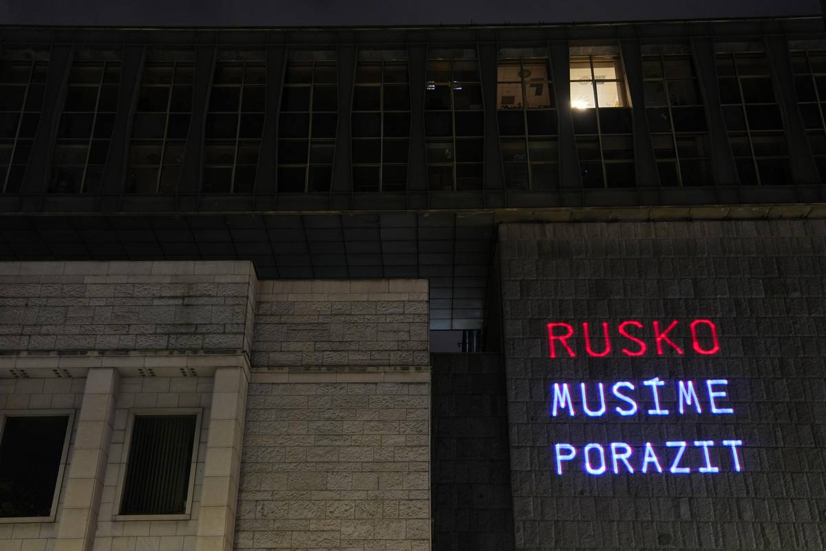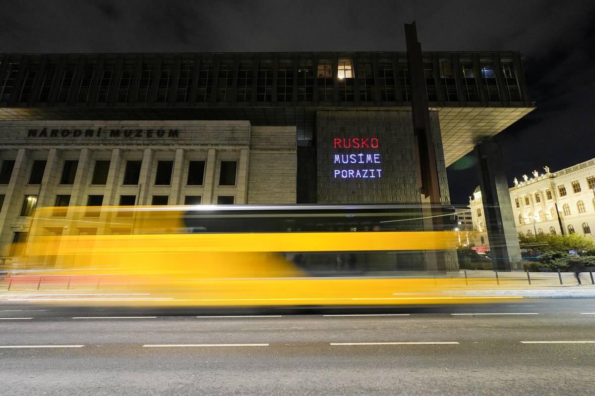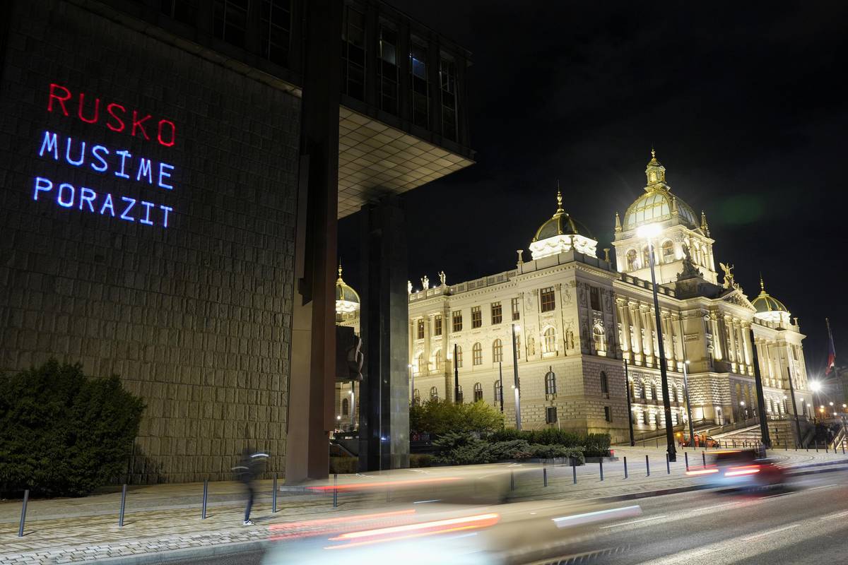 Spolky Kaputin a Občanský rozcestník umístily pomocí laseru vlajku Ukrajiny na novou budovu Národního muzea k výročí vpádu Ruska na Ukrajinu.
