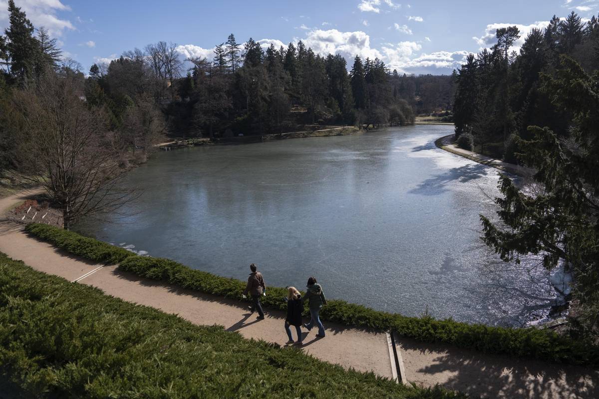 Podzámecký rybník stále pokrytý ledem, ale bruslit by se na něm nedalo v žádném případě.