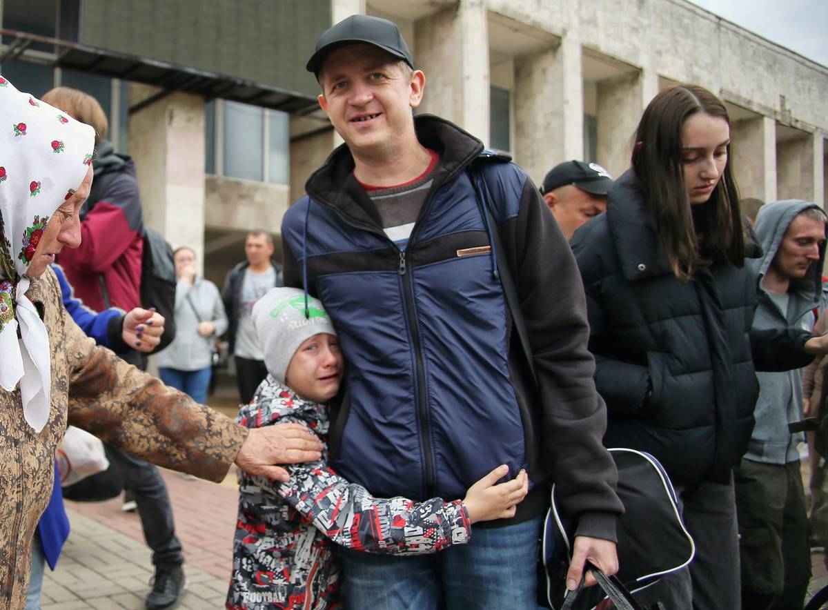 Odvedenec se loučí ve městě Batajsk v Rostovské oblasti s rodinou (26. září).