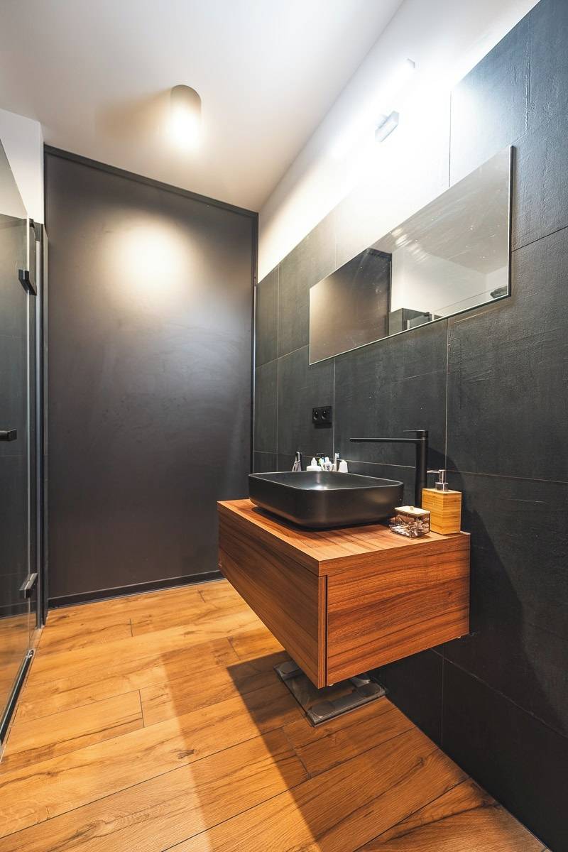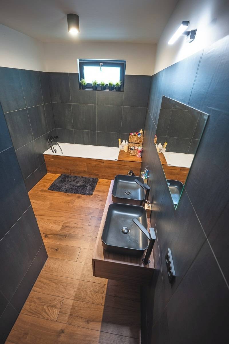V přízemí se nachází jedna ze dvou koupelen. Za posuvnými černými dveřmi je navržená vana a také je tam umístěná jednotka tepelného čerpadla.
