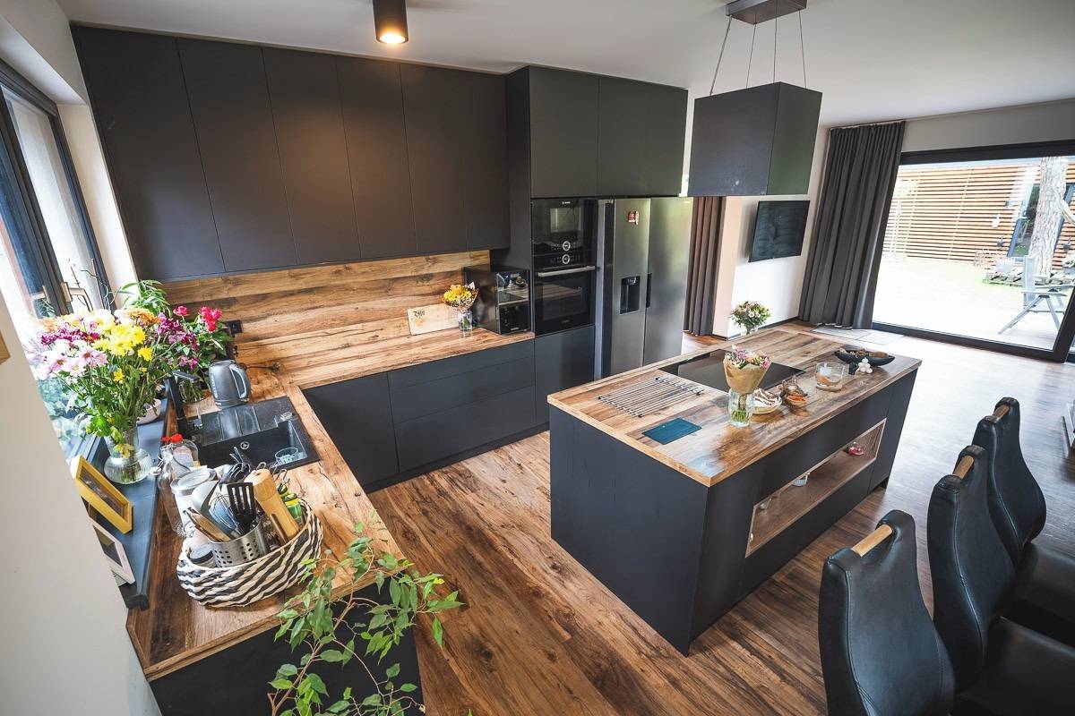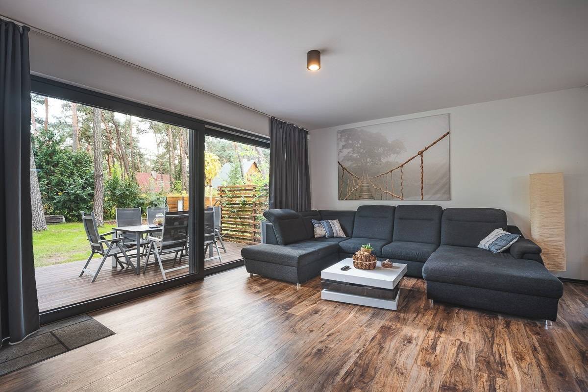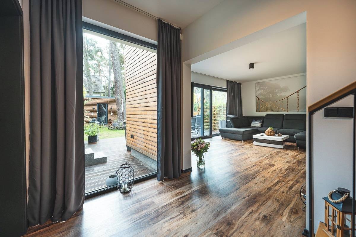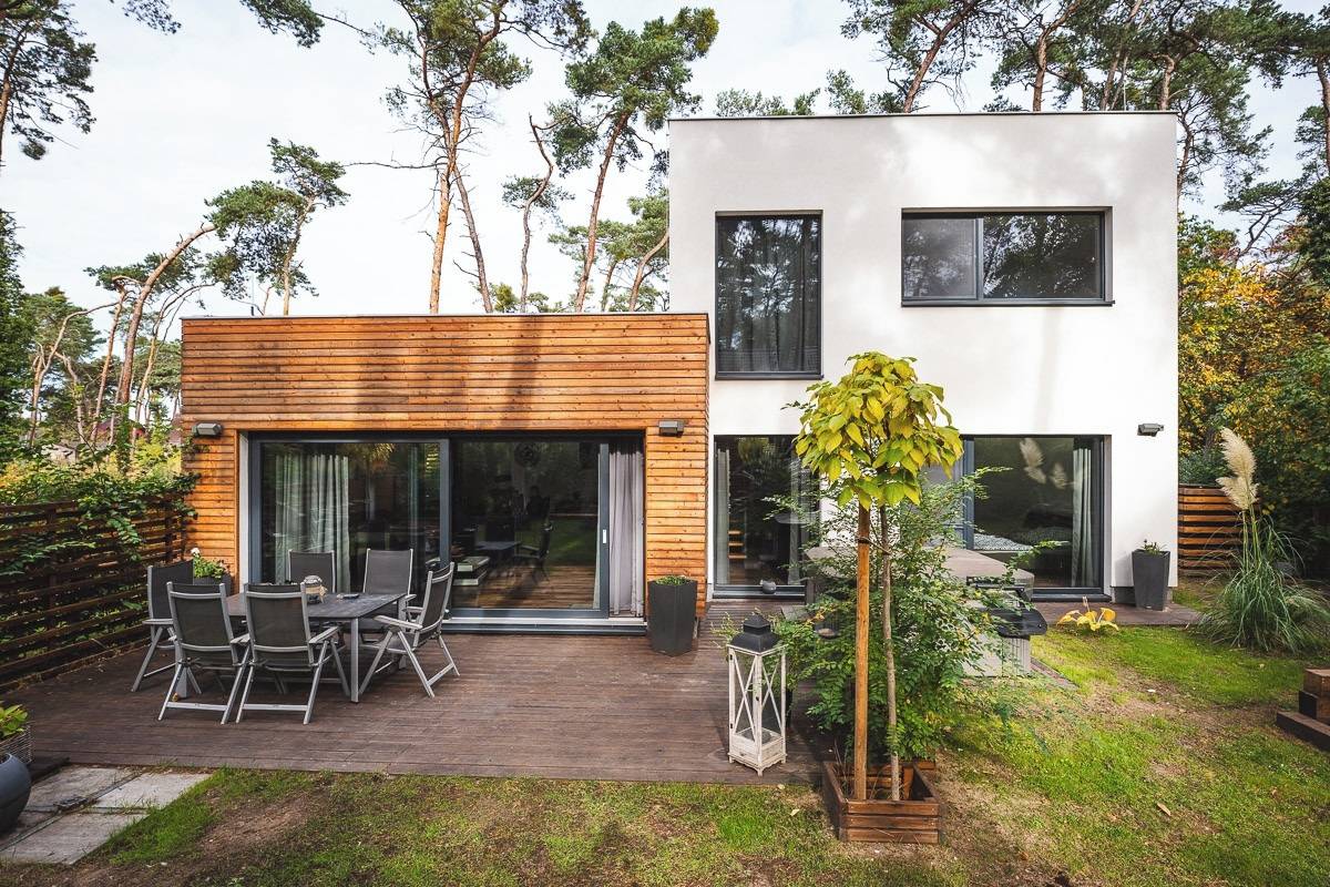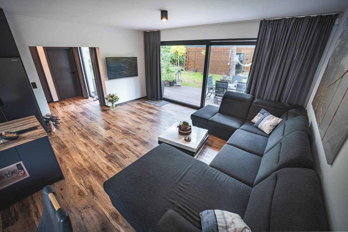 Obytný prostor je orientován do zahrady a lesního prostředí, což zajišťuje klid a soukromí.