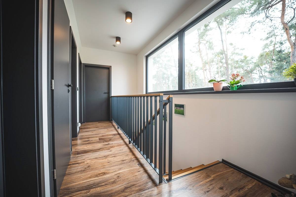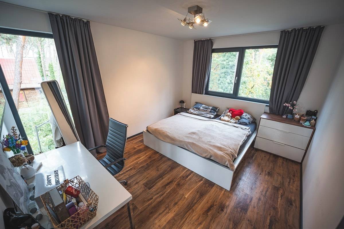Ložnice je orientována do zahrady a lesního prostředí, což zajišťuje klid a soukromí.