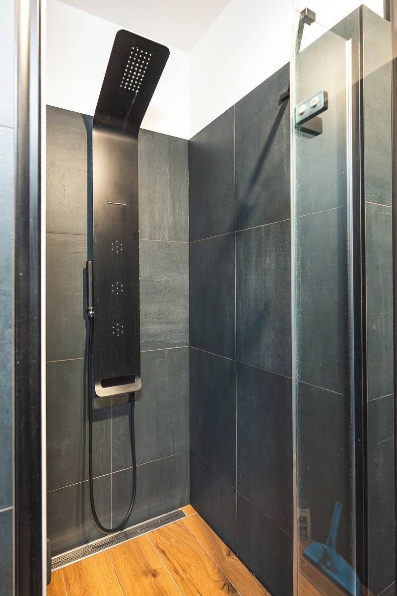 Koupelna v přízemí je vybavena bezbariérovým sprchovým koutem s podlahovým žlabem.