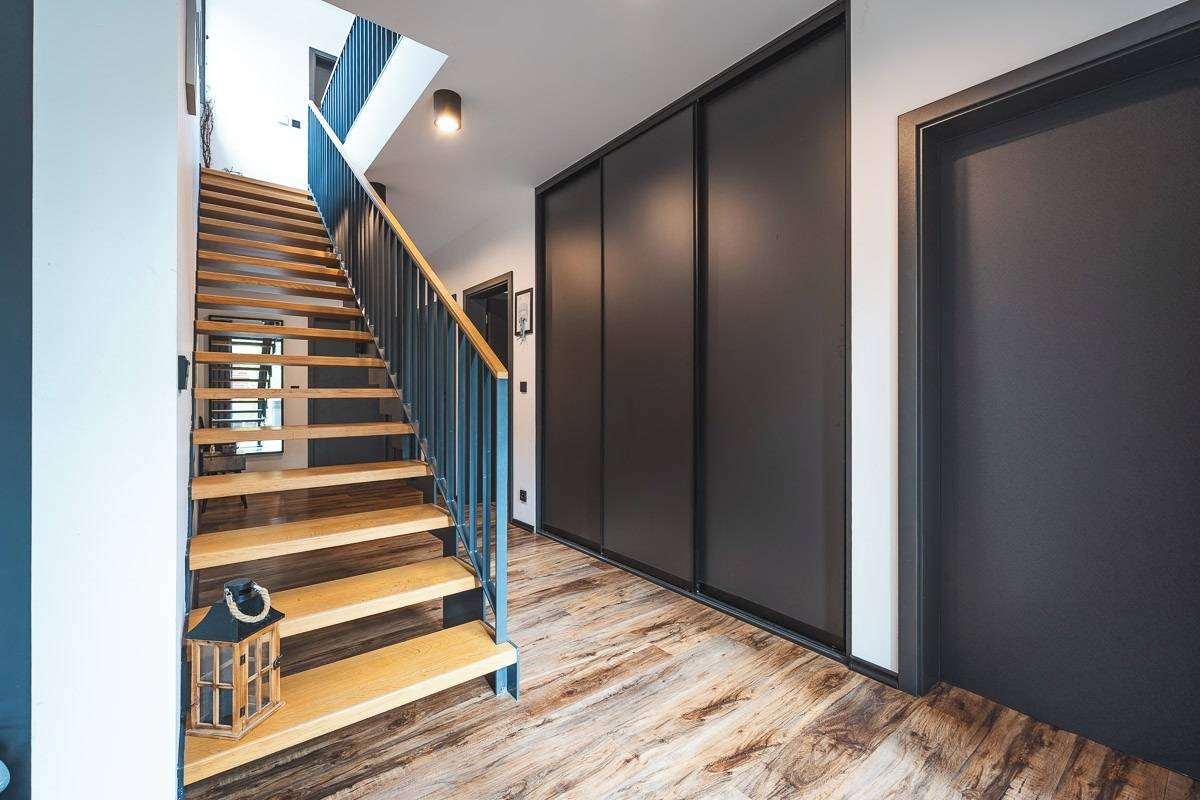 Vstupní hala propojuje přízemí s patrem pomocí otevřeného schodiště, které podporuje vzdušnost interiéru.