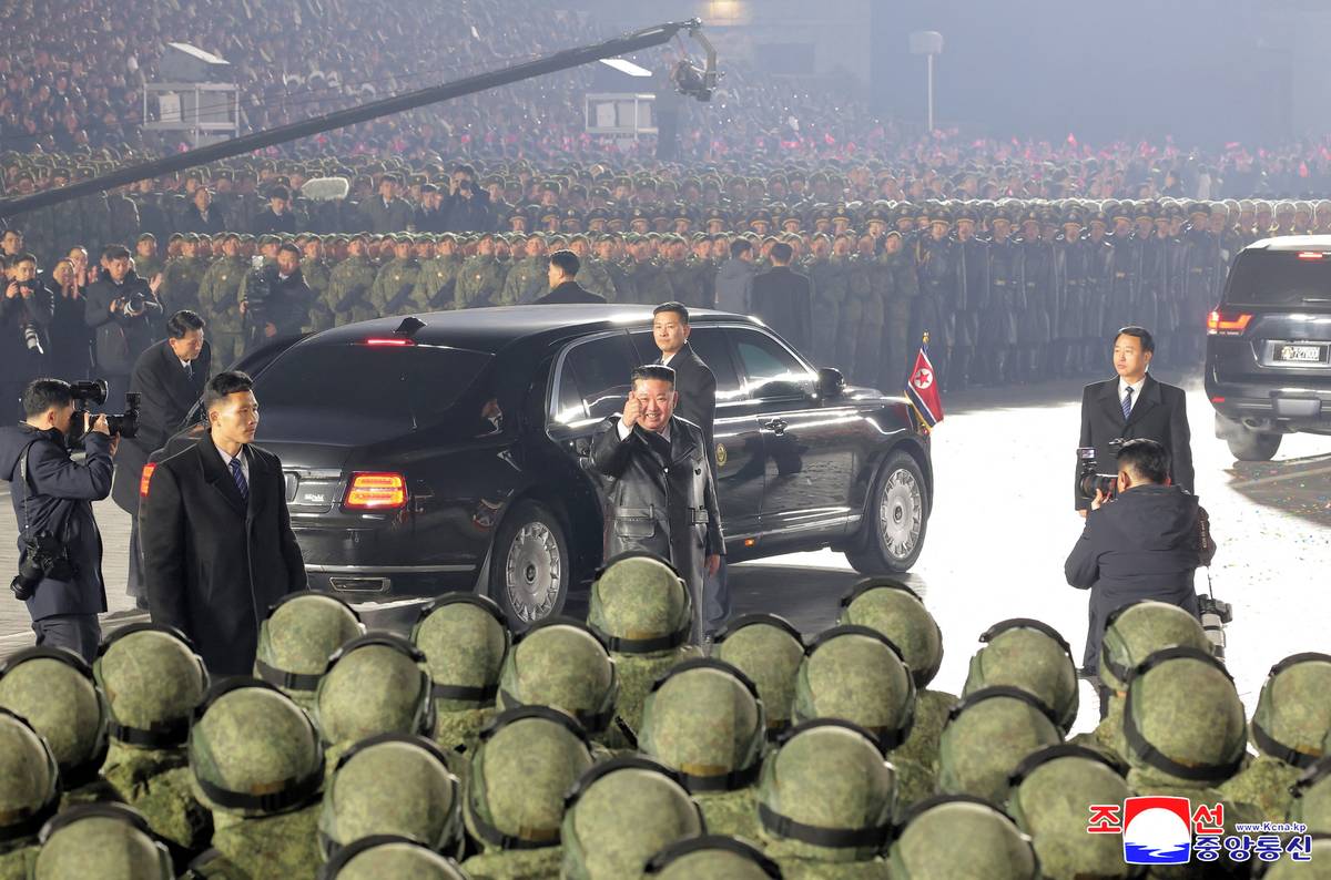 Hromadné akce severokorejského režimu jsou vždy pečlivě naplánované. Včetně toho, kdo smí vůdce pozdravit. Nezávislí fotografové se na přehlídku nedostali. I na snímku, kde Kim-Čong-un zdraví zdraví obyvatele, je ale jeho dcera jen o kousek vedle.