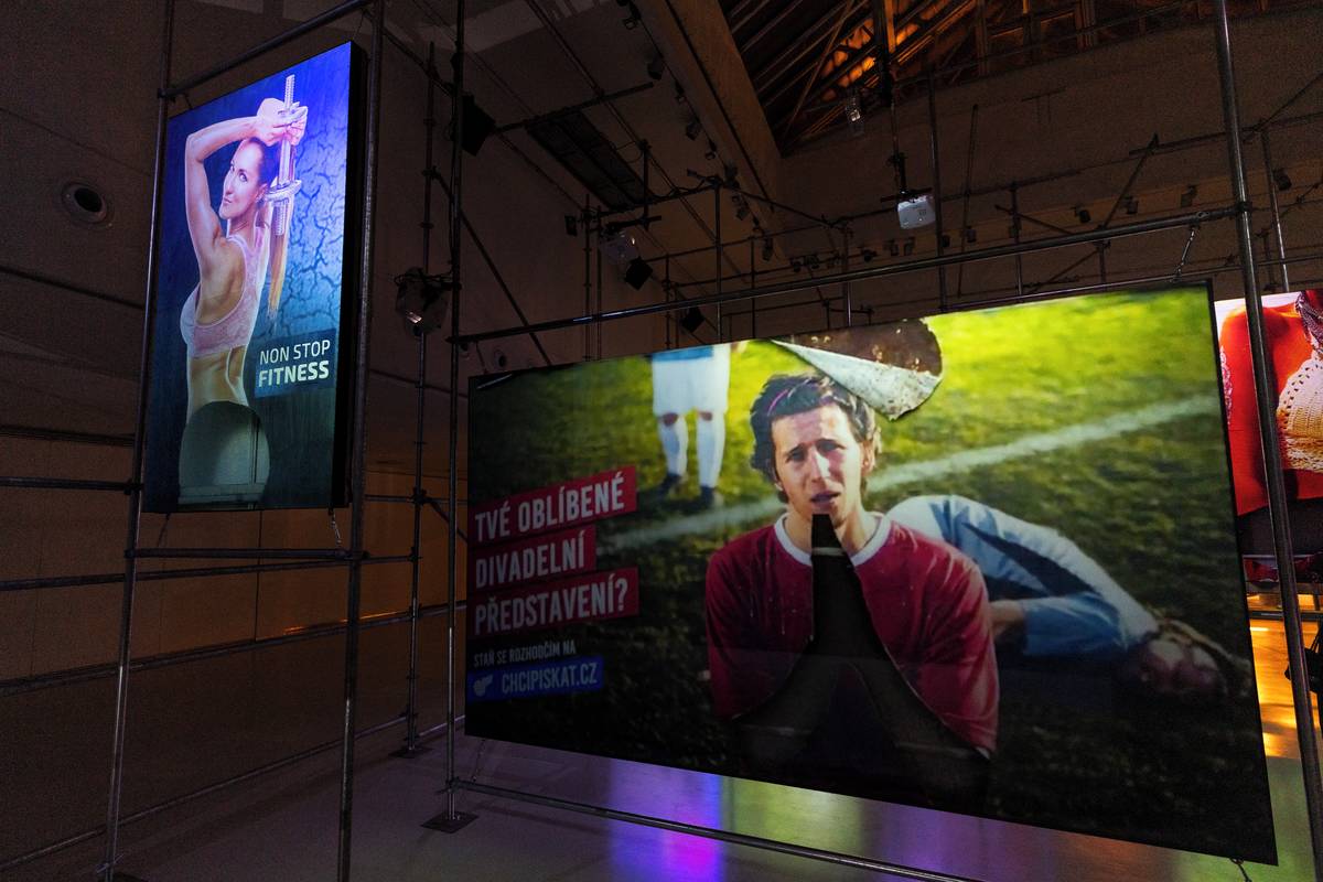 Umělec reklamní nosiče posbíral z míst, kde stály nelegálně. Pak je rozřezal. Modlícímu se fotbalistovi chybí ruce, místo nich dírou prosvítá vyprázdněnost.