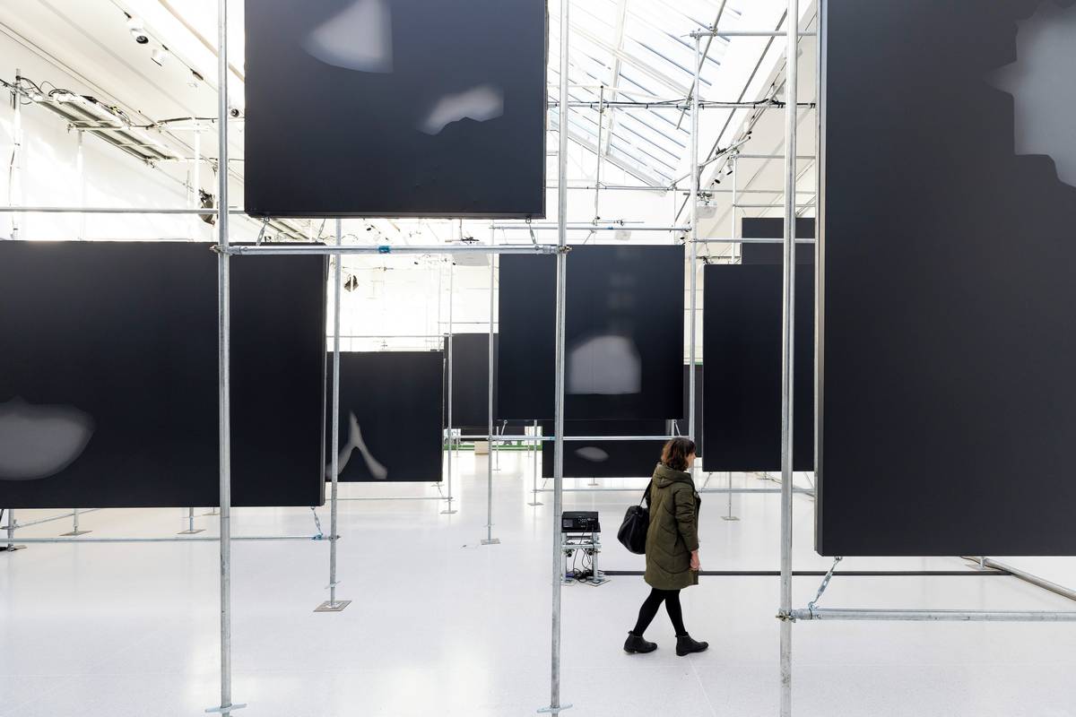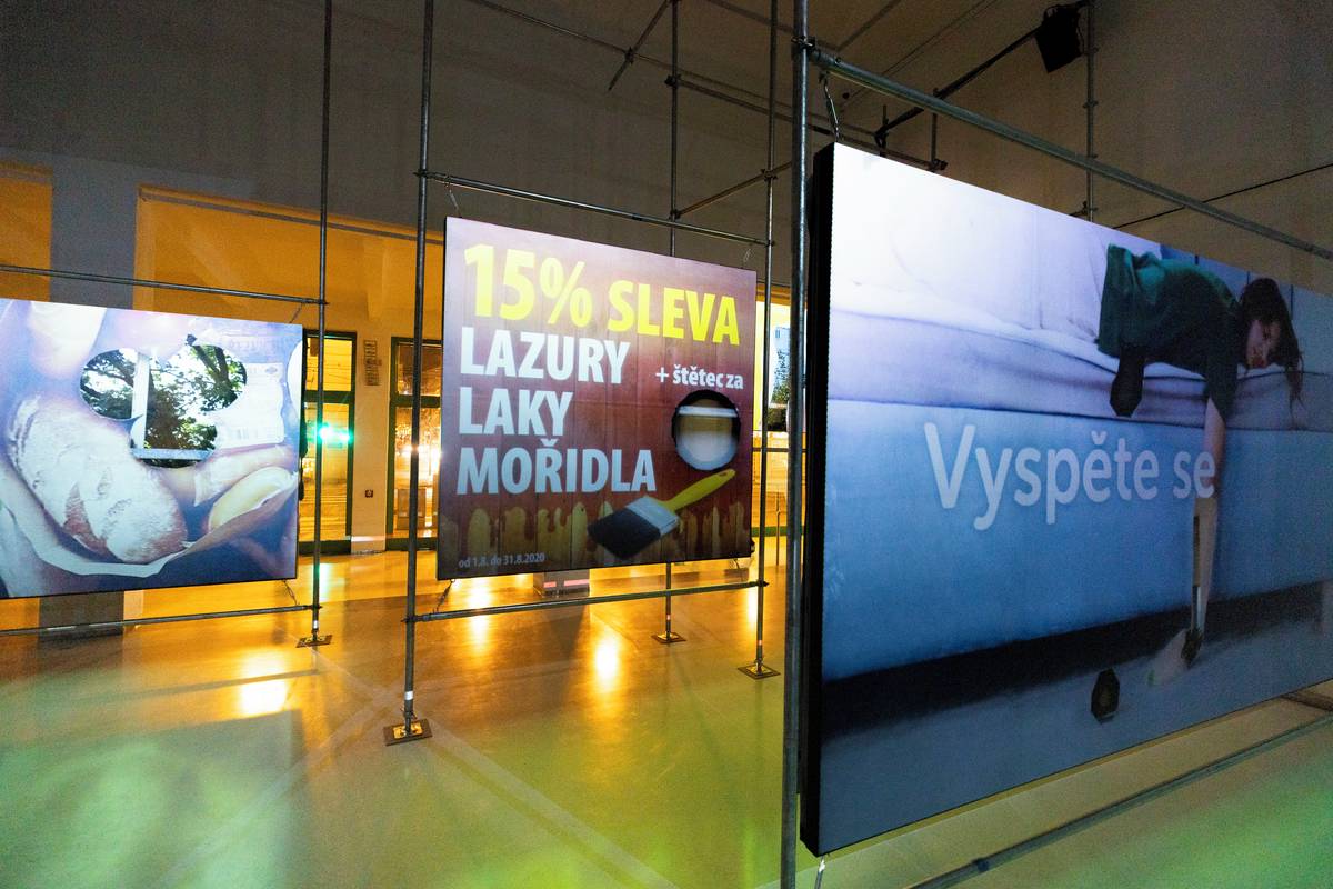 Přes den jako by Landform byla úplně jiná výstava. Je tu ticho, billboardy, na které se pouští projekce, jsou vypnuté.
