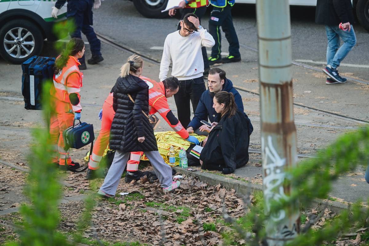 Záchranáři ošetřují ženu po vykolejení tramvaje v Miláně
