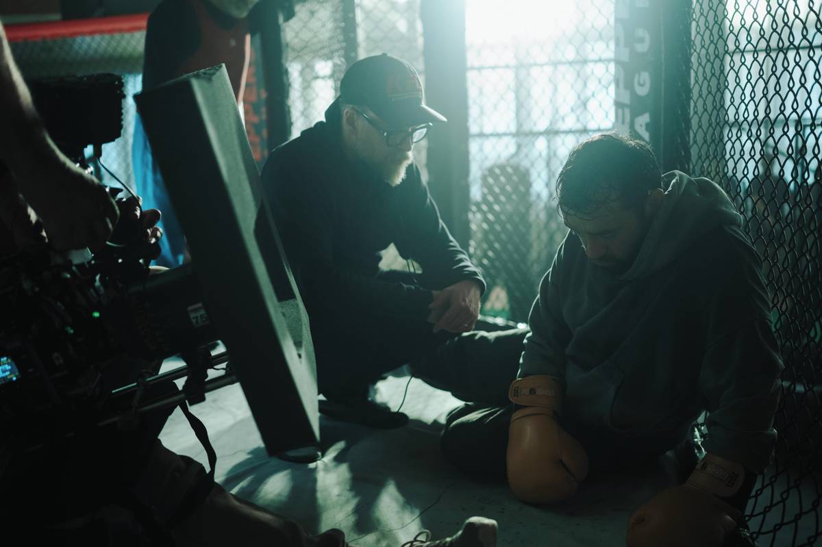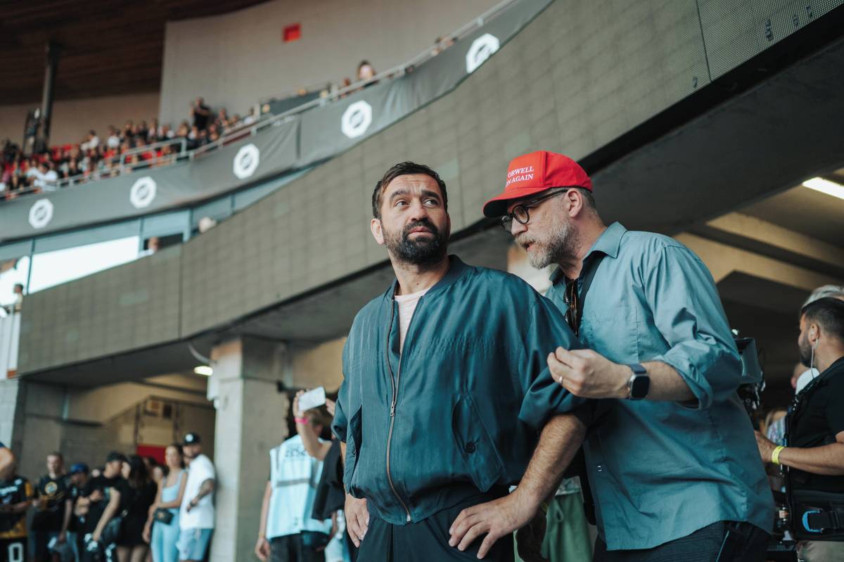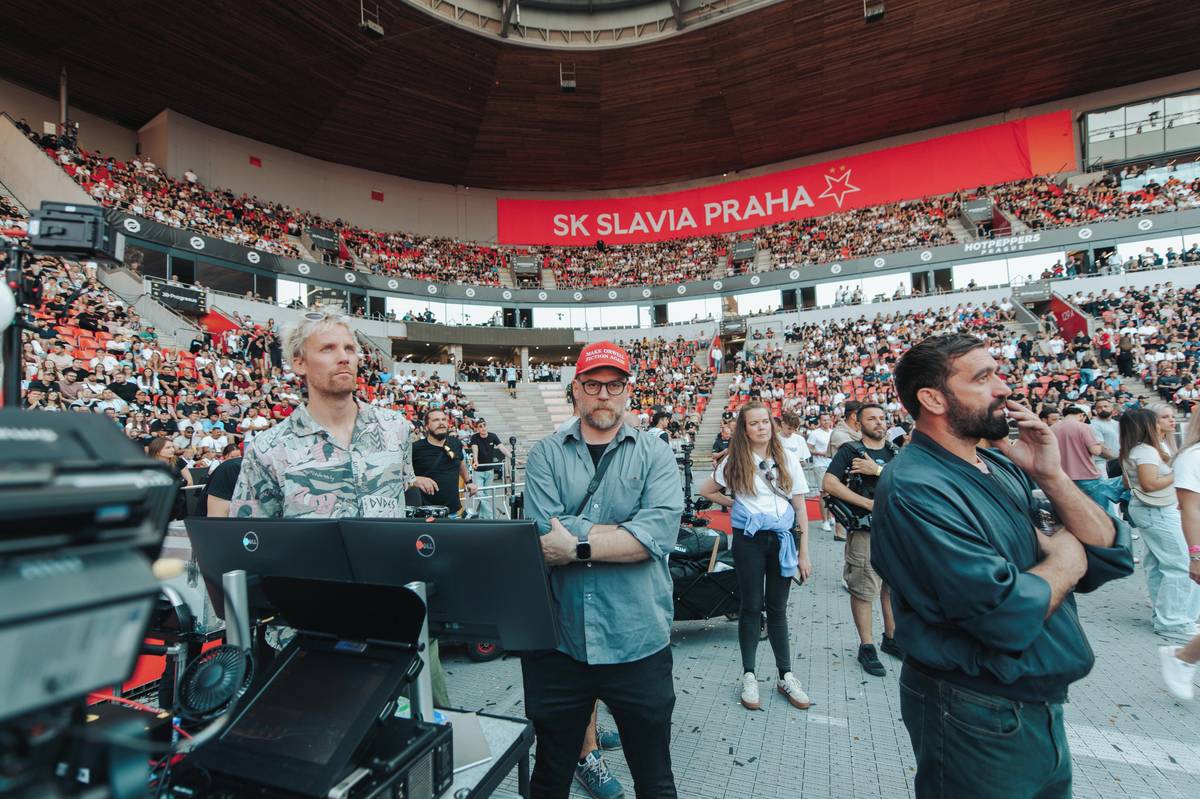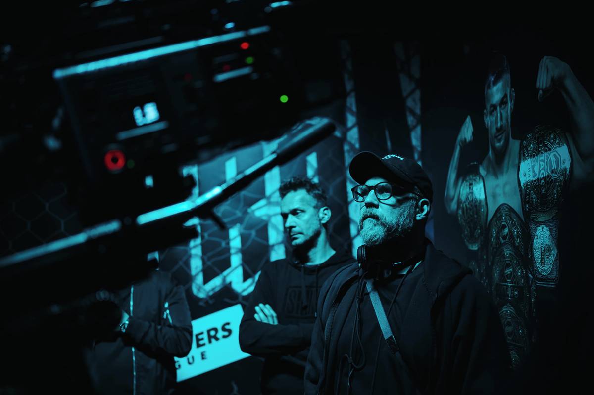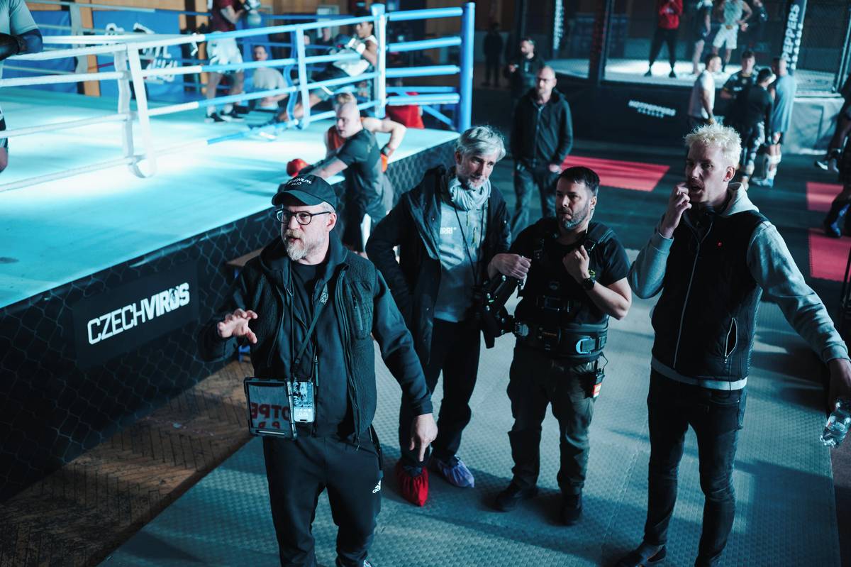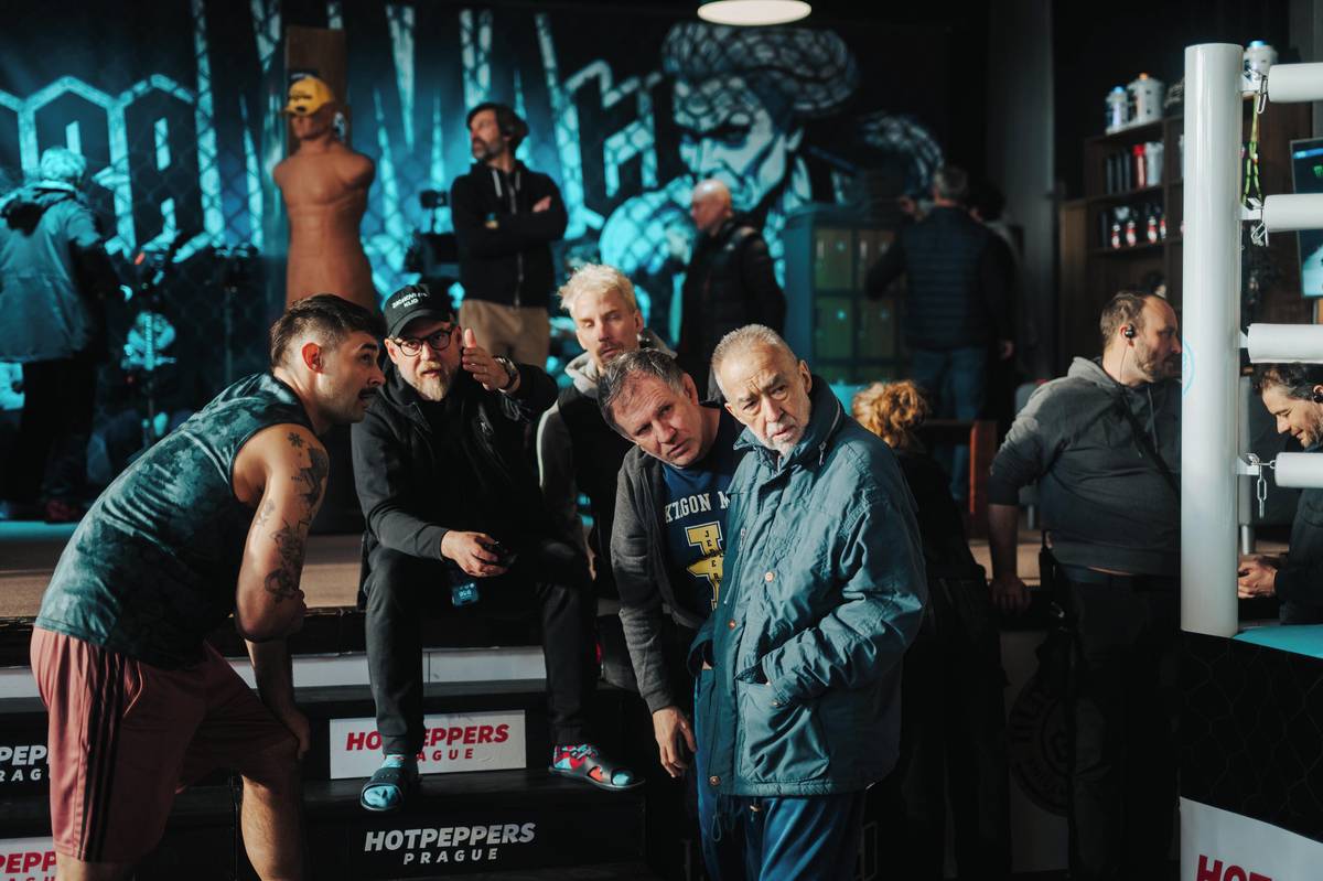 Natáčení scén na MMA zápasu na stadionu fotbalové Slavie v Edenu. Režiséři Vojtěch Frič a Tomáš Dianiška vlevo, vpravo herec Milan Ondrík.
