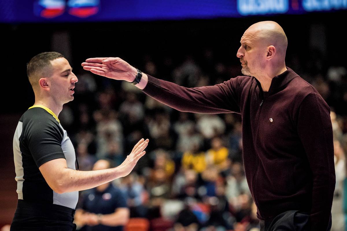Český trenér Luboš Bartoň při gestikulaci k rozhodčímu