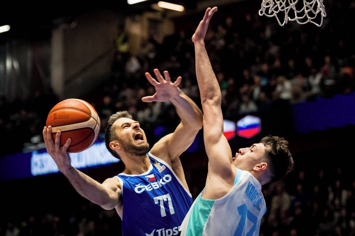 Vojtěch Sýkora se snaží skórovat přes slovinskou obranu