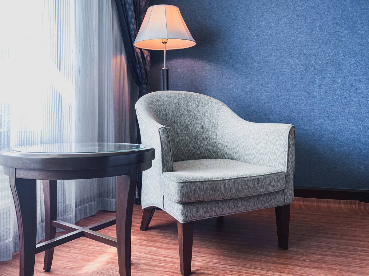 Kužel světla linoucí se ze stojací lampy jasně vymezuje zónu pro čtenářský koutek.